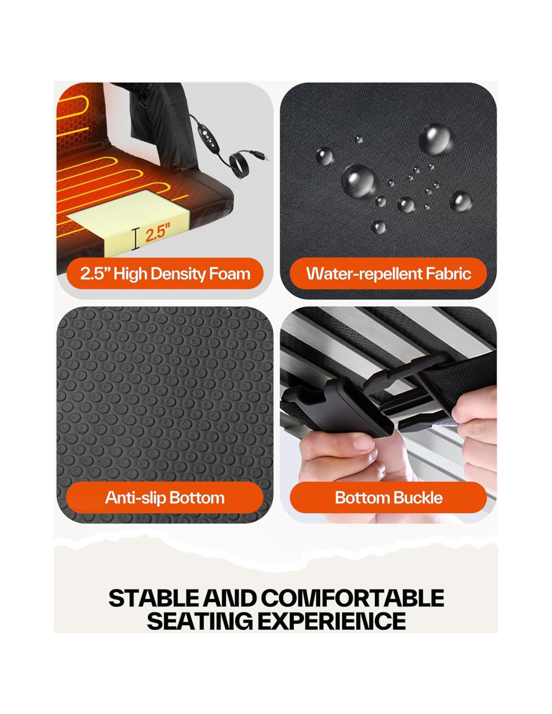 - Cojín Engrosado y Suave: Di adiós a los asientos duros de estadio. El asiento de gradería calentado Sportneer cuenta con un fuerte marco de acero, un cojín de espuma de alta densidad de 6.35 cm, y un respaldo alto de 40.6 cm para máxima comodidad y soporte confiable. Los reposabrazos acolchados a ambos lados añaden comodidad extra, haciendo que cada juego o evento sea una experiencia más agradable.