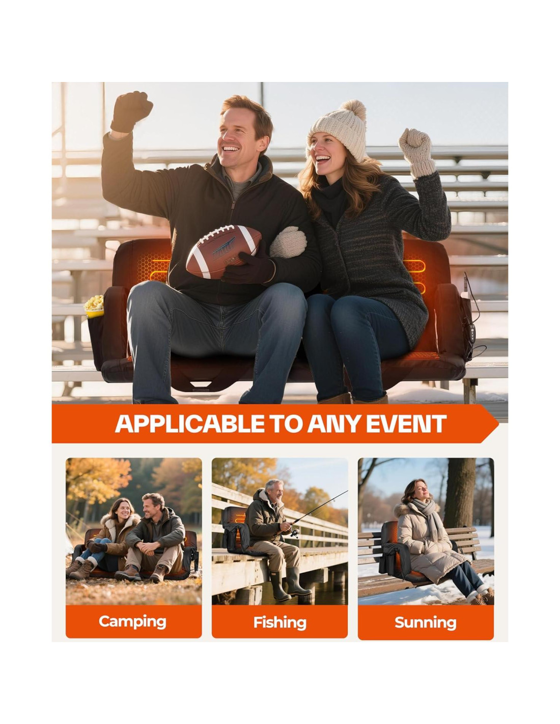 - Almacenamiento y Organización Convenientes: Mantente organizado en movimiento. Estos asientos de estadio calentados vienen con 2 portavasos para bebidas, un espacioso bolsillo lateral para teléfonos, paraguas o accesorios de conciertos/festivales, y un bolsillo trasero con cremallera para llaves, bocadillos y otros esenciales, todo al alcance de tu mano.