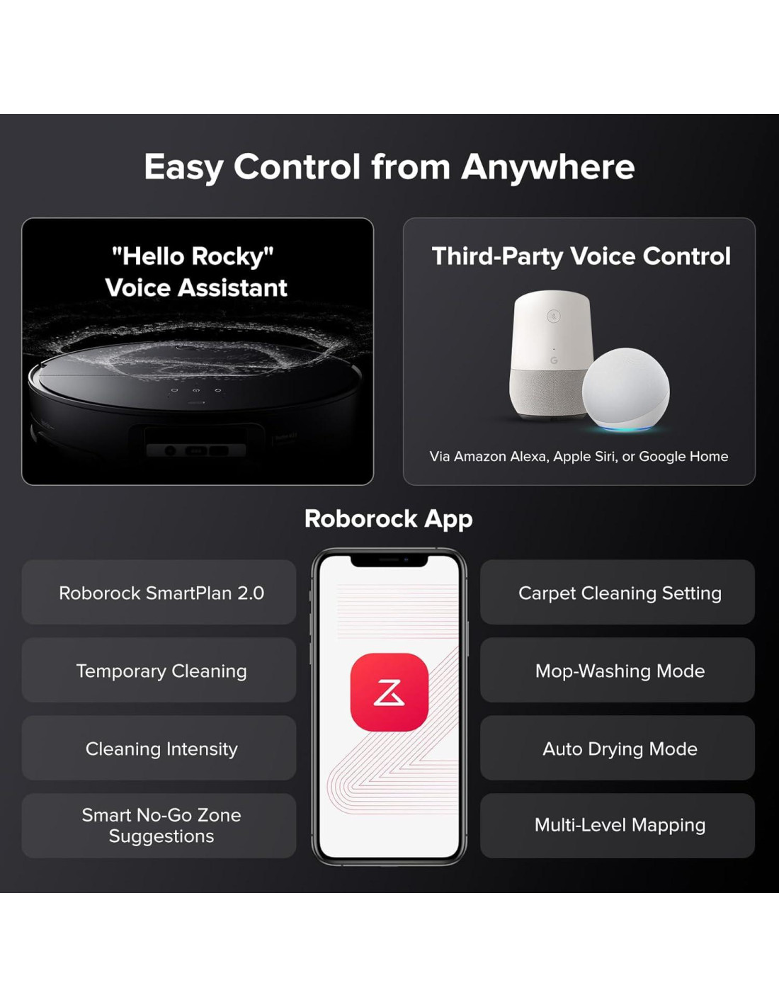 - Integración de Asistente de Voz Inteligente: Controla tu Roborock sin esfuerzo. Simplemente di 'Hola Rocky' para comandar tu robot aspiradora con tu voz. Puede limpiar áreas específicas, omitir habitaciones, vaciar el contenedor de polvo, limpiar la base y más, todo sin mover un dedo. Compatible con Alexa, Siri y Google Home para una fácil programación, incluso en movimiento. Además, disfruta de la compatibilidad Matter 2.0 para una experiencia de hogar inteligente mejorada.