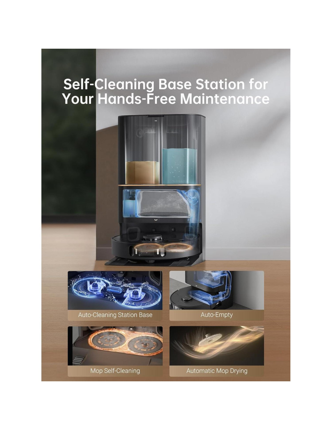 - Auto Mantenimiento Te Mantiene Libre de Manos La aspiradora puede vaciar su cubo de polvo, rellenar agua para fregar y lavar su mopa y la tabla de lavar, asegurando frescura continua y ahorrándote tiempo en la limpieza.