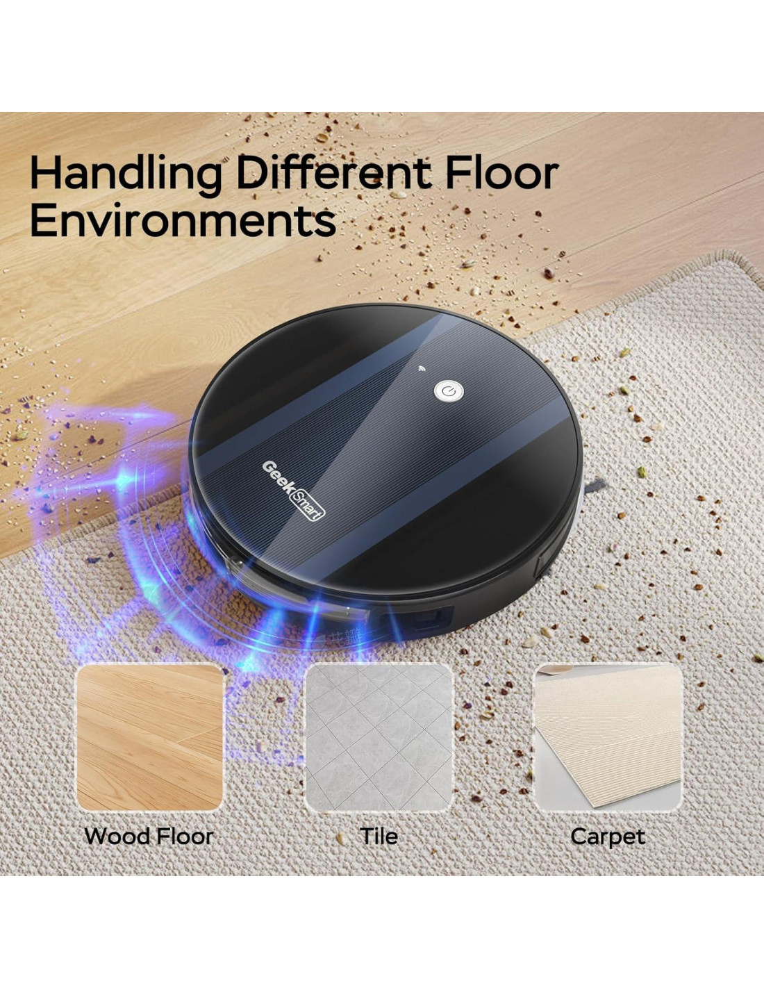 Geektale, protege la seguridad de tu familia contigo. Bienvenido a comenzar una vida más inteligente y conveniente con nosotros. Programa tus sesiones de limpieza en la APP Geek S_mart según la frecuencia con la que desees limpiar. Cuando la batería esté baja, el robot regresará a la base para recargarse y luego continuará desde donde lo dejó. Cuando la aspiradora robot comience a limpiar o necesite ser cargada, habrá un aviso sonoro.