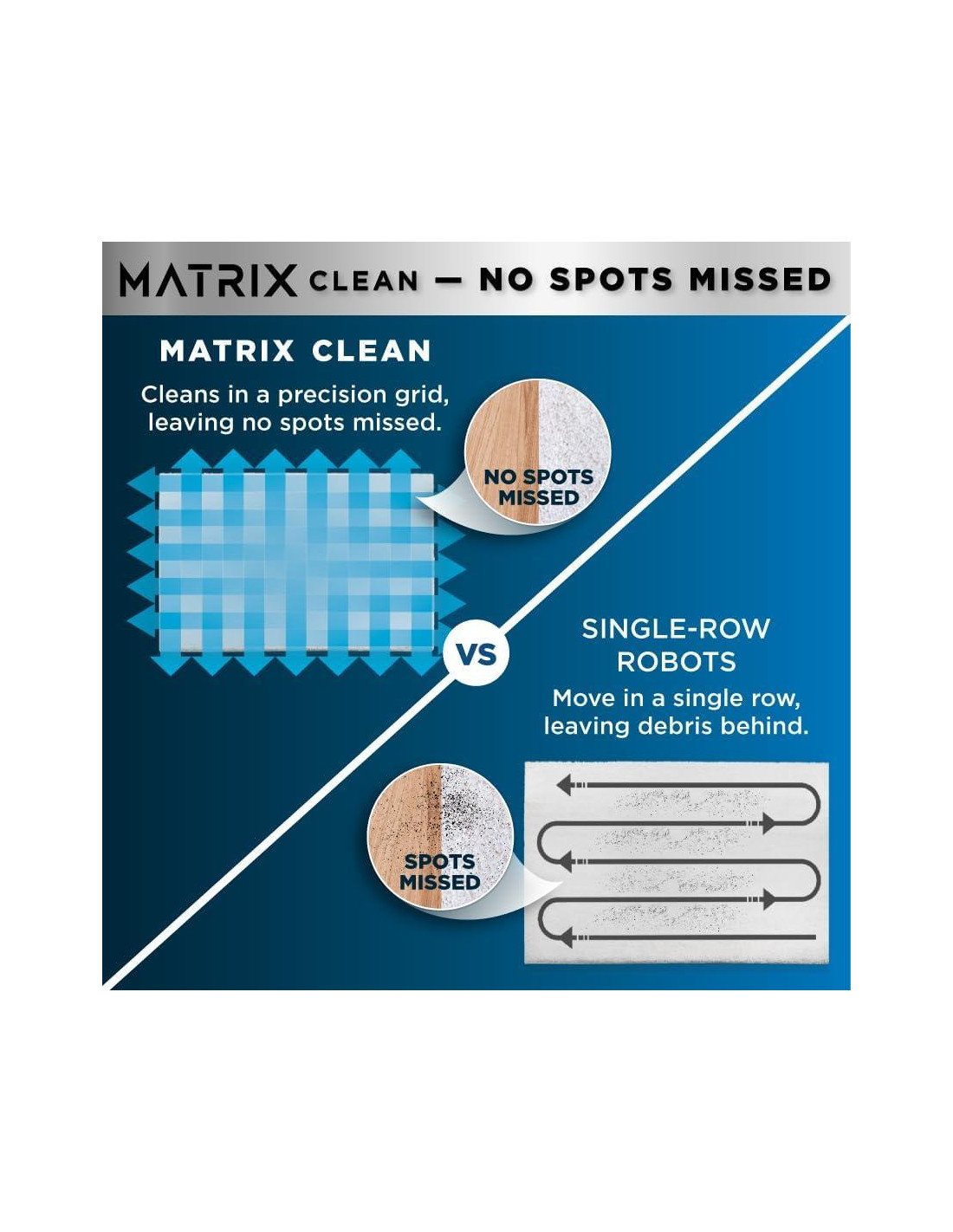- NINGÚN PUNTO OLVIDADO: Con Matrix Clean, la aspiradora robótica limpia utilizando una cuadrícula de matriz de precisión, pasando múltiples veces sobre la suciedad y los desechos, ofreciendo un 30% mejor limpieza de alfombras* (*vs. RV2610WD probado en una sola pasada sobre arena de bucle nivelado).