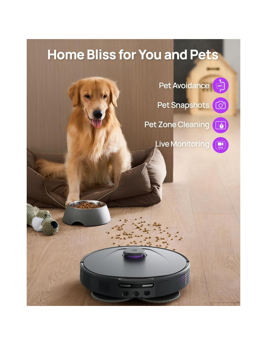 - 18,000Pa para Verdadera Limpieza Profunda: Con más de 2x la succión de productos similares, la aspiradora robot levanta todo, desde polvo hasta grandes escombros en madera dura y alfombras. La detección inteligente de alfombras aumenta la succión mientras levanta la mopa para una limpieza profunda pero seca.