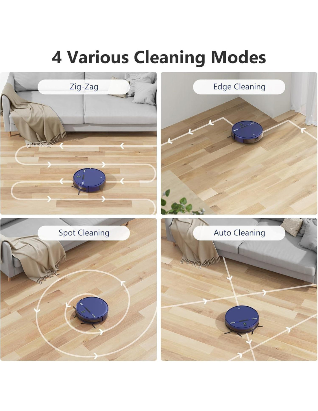 - [4 Modos de Limpieza de Alta Eficiencia] Esta aspiradora robótica proporciona cuatro modos de limpieza: Automático, Spot, Borde y Zig-zag, que se pueden seleccionar de manera flexible según las necesidades reales de la familia. Entre ellos, el camino en zig-zag puede cubrir la mayor área para la limpieza, reducir escaneos perdidos y aumentar la eficiencia en un 30%.