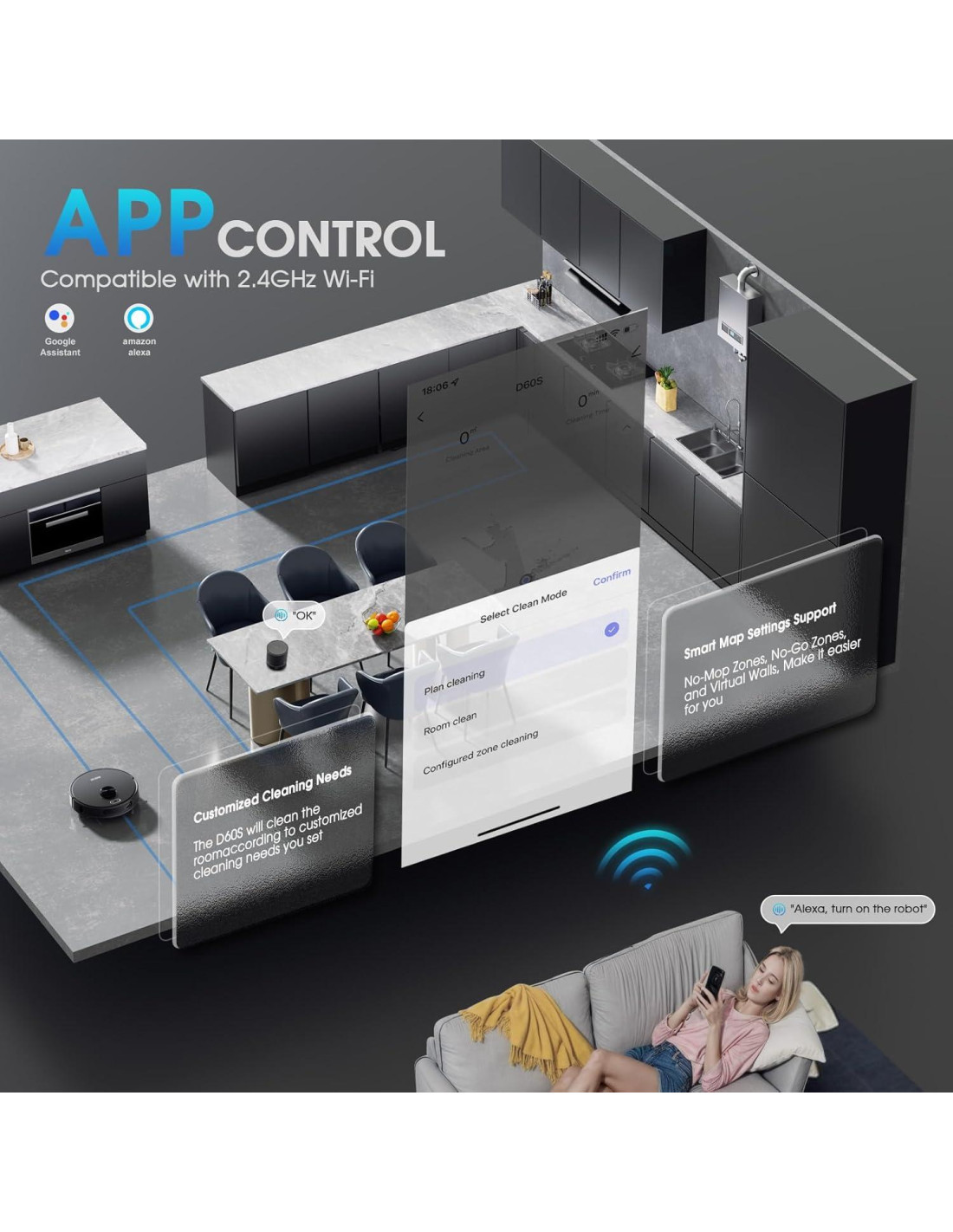 - Navegación Inteligente LiDAR de 360: El aspirador robótico D60S mejorado cuenta con tecnología avanzada de mapeo LiDAR que escanea su hogar en tiempo real, construyendo planos de piso 2D precisos (hasta 5 mapas guardados) para dividir inteligentemente las habitaciones, optimizar las rutas de limpieza y maniobrar sin esfuerzo alrededor de los muebles. Perfecto para hogares de múltiples pisos, su sistema guiado por láser asegura una cobertura metódica sin puntos ciegos, eliminando golpes aleatorios o áreas olvidadas.