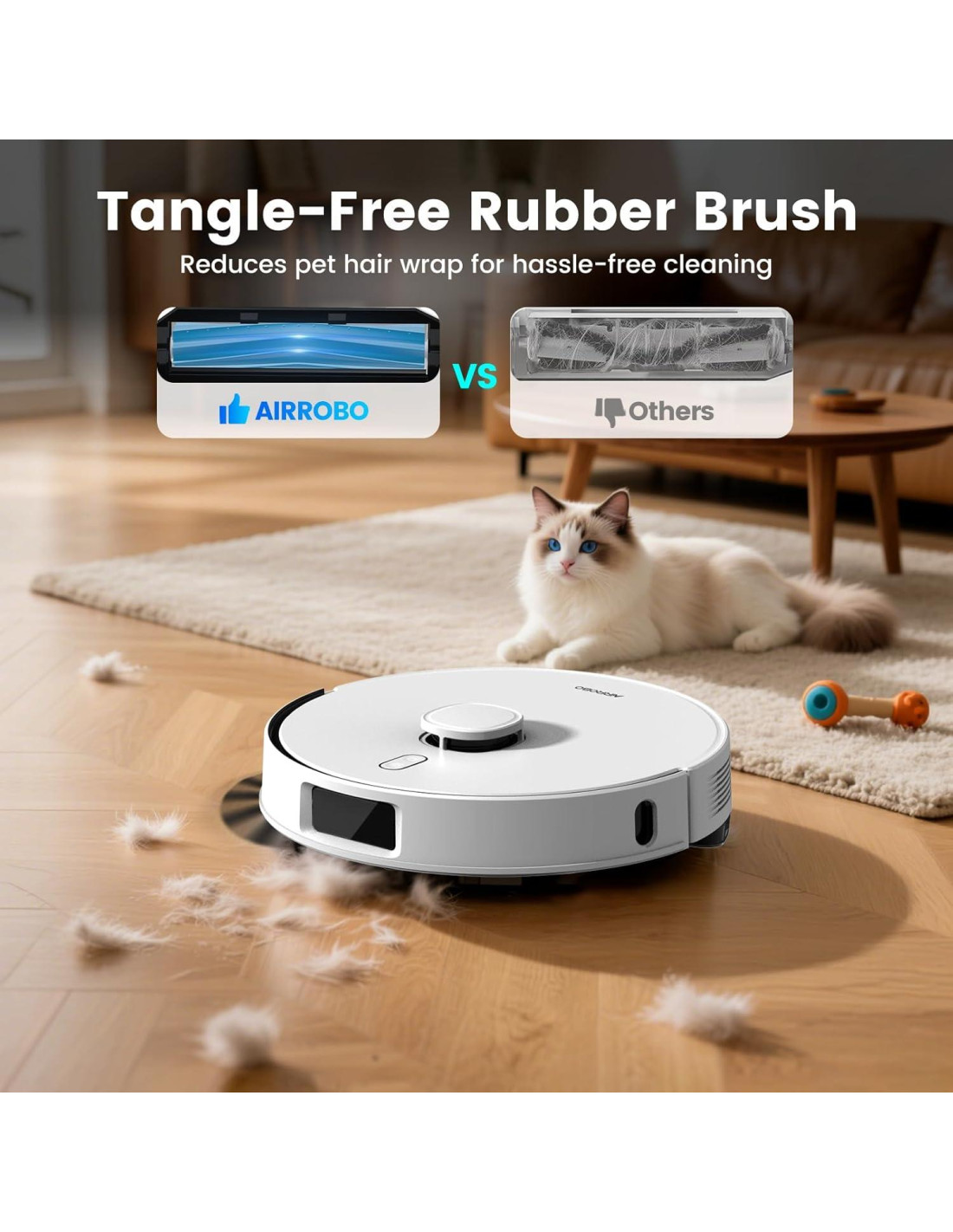 - Cepillo de Goma Sin Enredos para Pelo de Mascotas: Diseñado para hogares con mascotas, esta aspiradora robot AIRROBO T30+ cuenta con un avanzado cepillo de goma que resiste el enredo de pelos, minimizando obstrucciones y ofreciendo una limpieza sin complicaciones