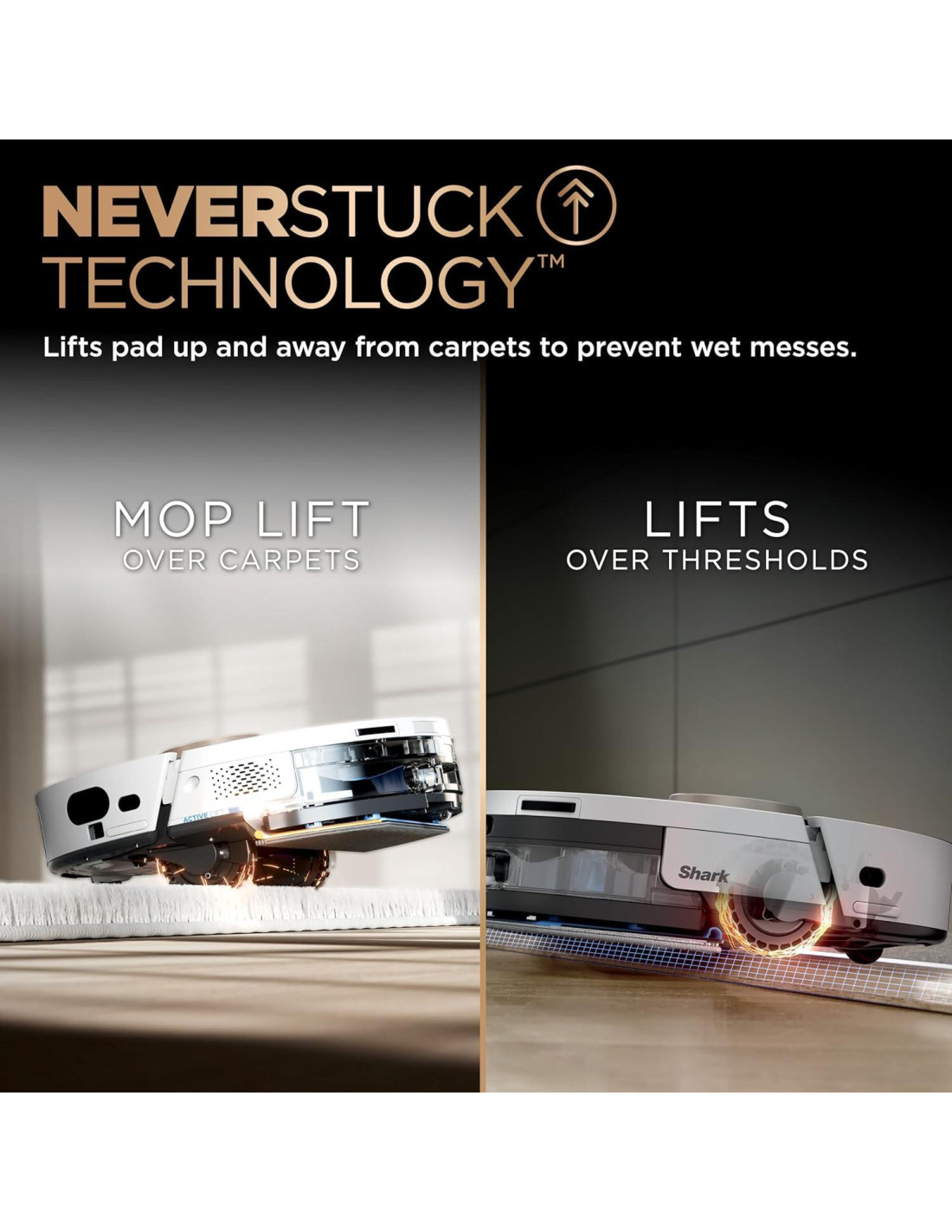 - HASTA 2X MEJOR COBERTURA DE LIMPIEZA*: Con la tecnología NeverStuck, el robot se levanta sobre obstáculos y cruza umbrales. Al trapear, mantiene la almohadilla por encima de las alfombras para evitar desorden húmedo y ofrecer cobertura en toda la casa. (*vs. Shark ION).