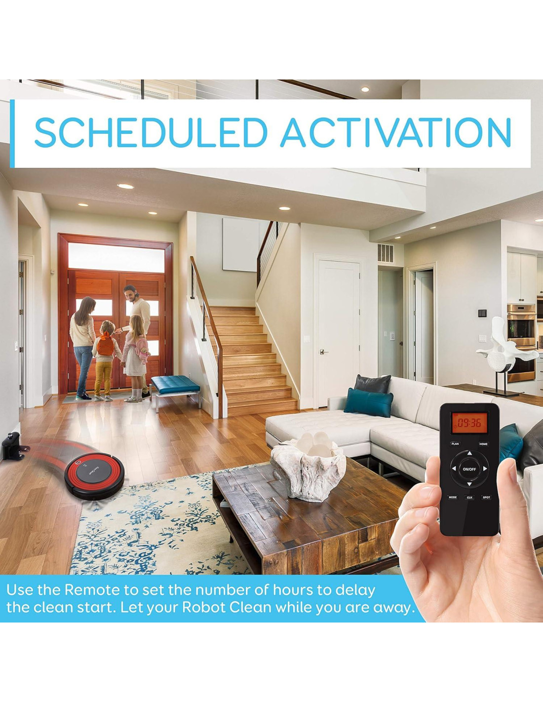 - ACTIVACIÓN PROGRAMADA: Mantén tu hogar tranquilo y pacífico. El programador automático se activa y ejecuta la aspiradora a cualquier hora programada mientras estás fuera. Robo limpia azulejos, alfombra dura y piso de madera