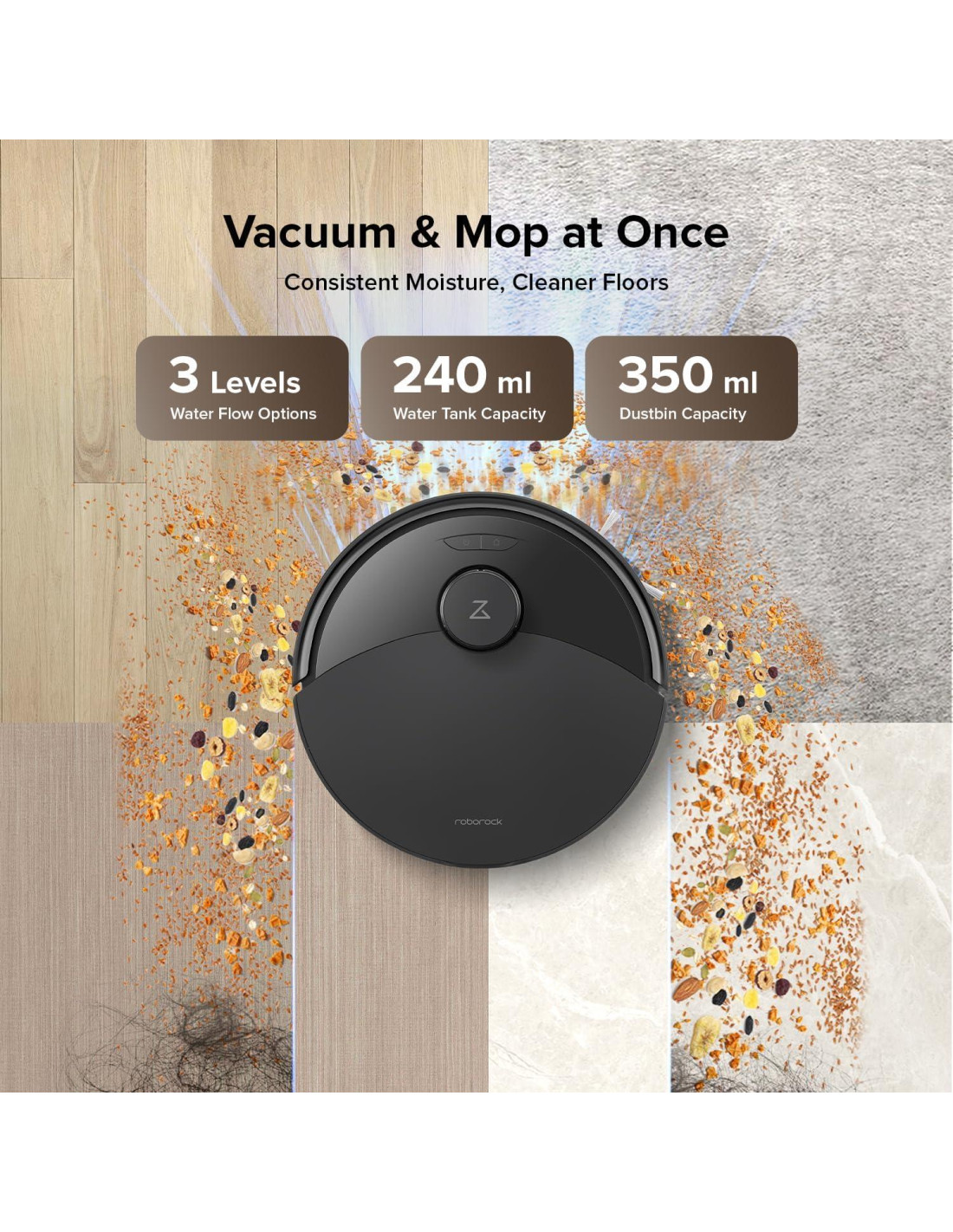 - Mopa y Aspiradora en Un Solo Paso: Ahorra tiempo en una sola pasada, aspira y mopa simultáneamente, con flujo de agua ajustable para abordar derrames, manchas y polvo diario.