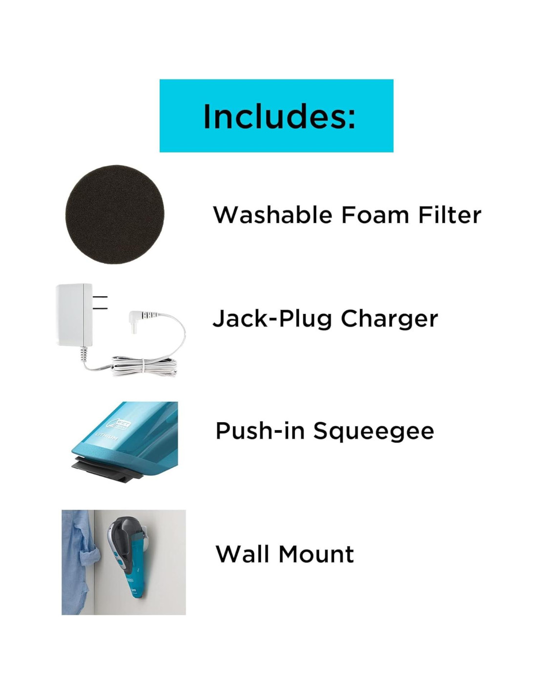 - INCLUYE - (1) Aspiradora de mano HLWVA325J21, (1) Cargador de enchufe, (1) Soporte de pared, (1) Escobilla de goma, (1) Filtro de espuma lavable (VLWF100).