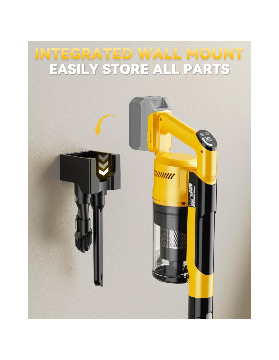 - Almacenamiento Montado en Pared y Fácil Organización - Viene con un sistema de montaje en pared integrado, permitiéndote almacenar ordenadamente la aspiradora y todos los accesorios en un solo lugar. ¡Ahorra espacio y mantén tu hogar libre de desorden!