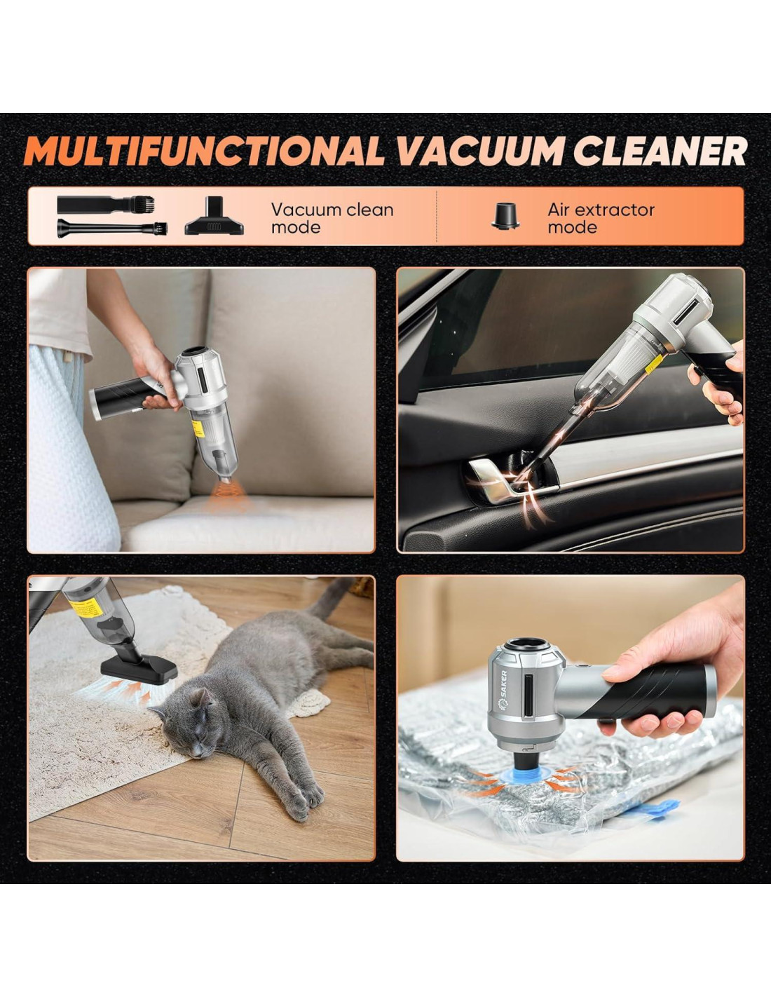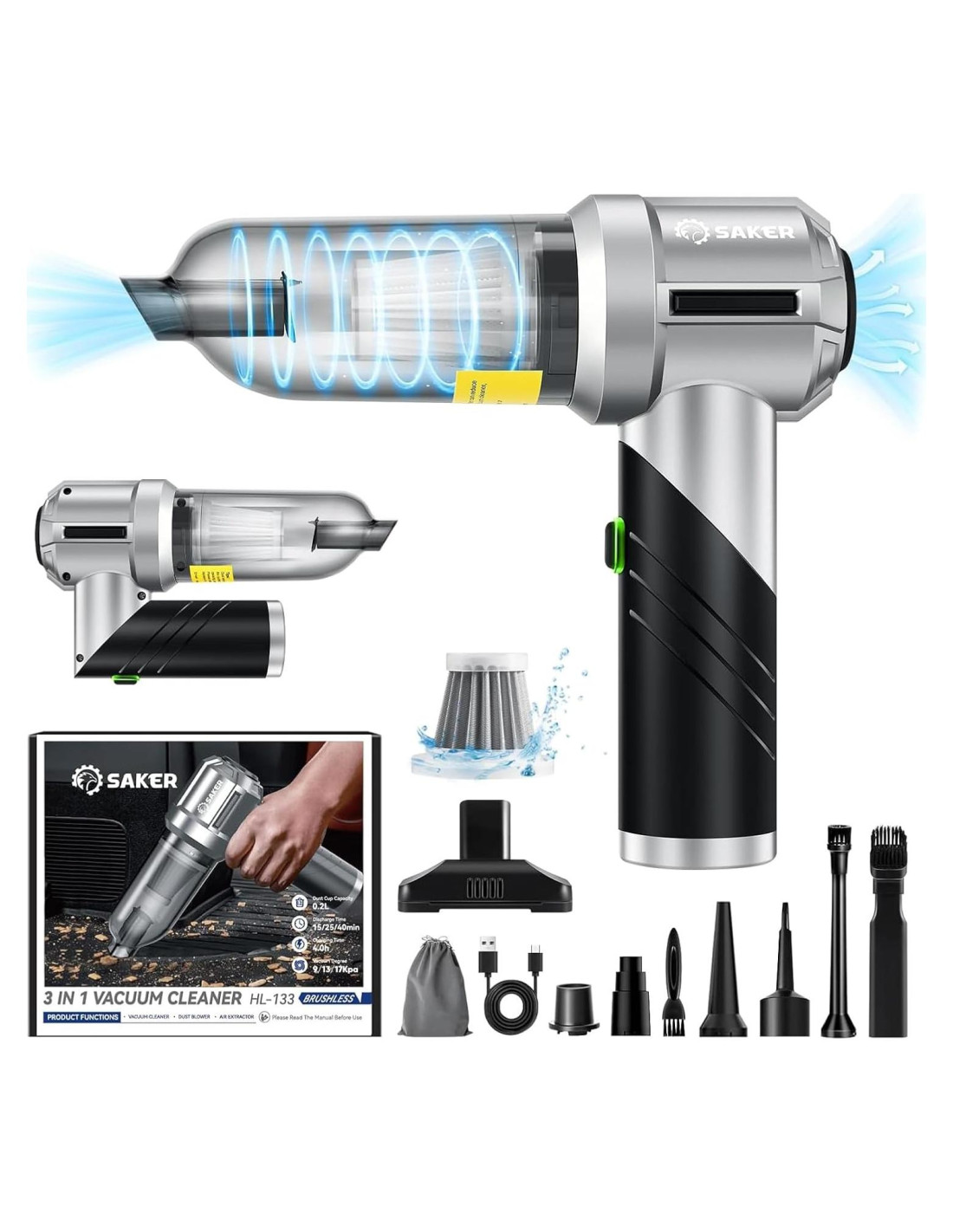 - [Aspiradora Mini Multifuncional 3-en-1] La aspiradora mini Saker está equipada con una variedad de accesorios para satisfacer varios escenarios de uso como soplar, succionar y bombear. No solo puede limpiar teclados de computadora, computadoras de escritorio, ventanas y otros espacios difíciles de limpiar, sino también sofás, asientos, coches, talleres de carpintería, oficinas, etc., para satisfacer sus diversas necesidades de limpieza.