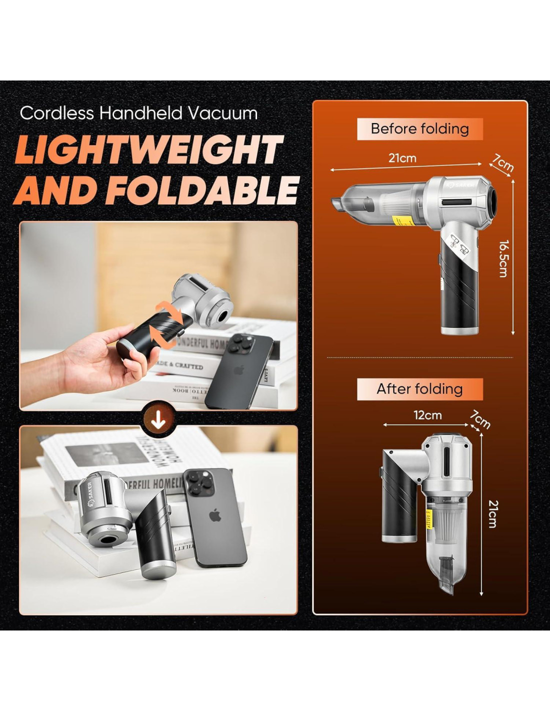 - [Ligera y Portátil] La aspiradora plegable Saker es compacta, solo 380g, el uso inalámbrico no está limitado por el espacio, y se puede rotar y plegar. Después de plegarla, es tan grande como la palma de la mano, lo que puede ser más conveniente para llevar y almacenar.