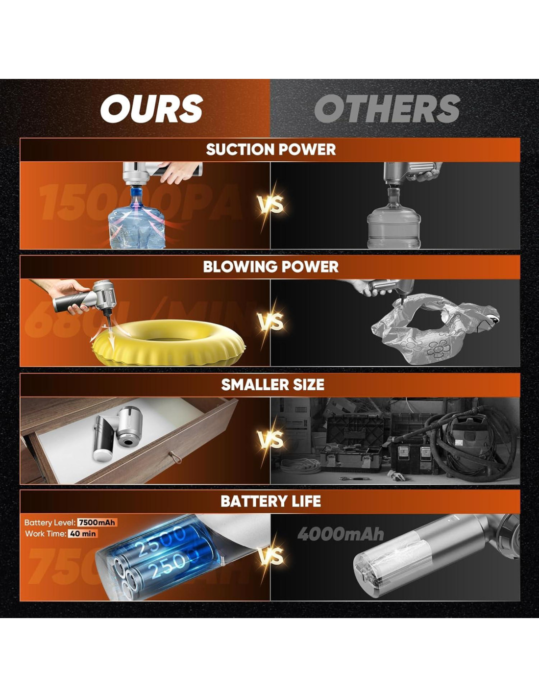 - [Larga Duración de Batería] Nuestra aspiradora es pequeña en tamaño pero poderosa en función, y está equipada con 3 baterías de 2500mAH de alta calidad para lograr una duración de batería en espera ultra larga. Usando tipo-c, puede recargarla rápidamente en cualquier momento y lugar, y puede resolver sus necesidades de limpieza, aspirado y soplado en cualquier momento y lugar.