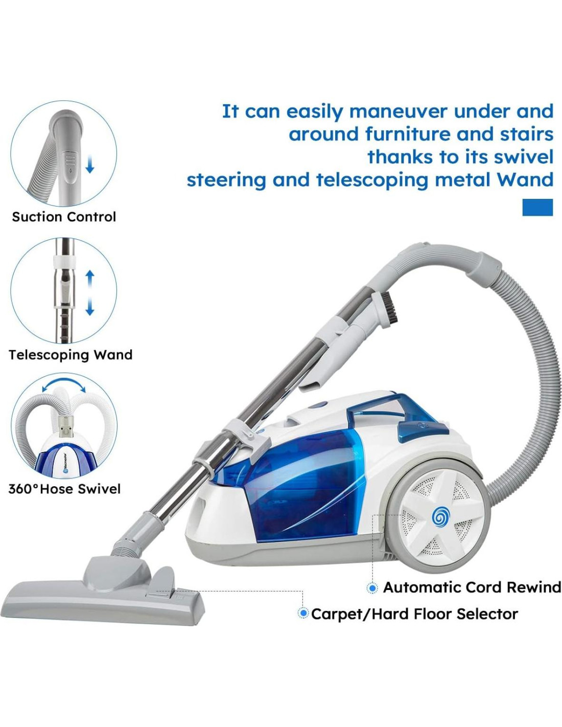 - Giro de manguera de 360 y sin daños en pisos duros: El giro de manguera de 360 elimina torceduras y enredos. Las ruedas suaves aseguran que los pisos de madera no sufran rasguños ni marcas.