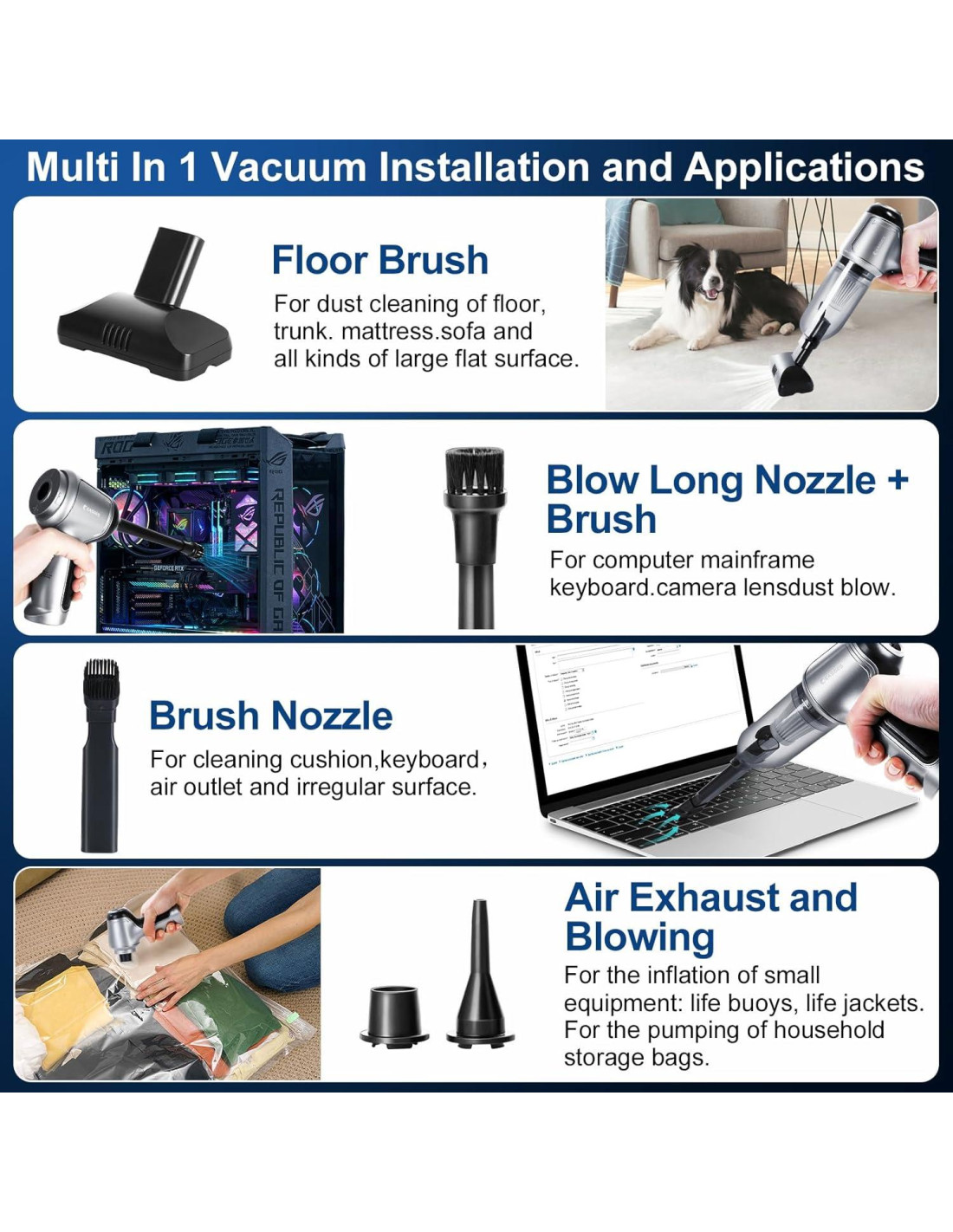 - [3-En-1 Aspiradora de Mano] La aspiradora para coche con tecnología de sellado cónico ingeniosa permite convertirla fácilmente en un potente soplador o inflador. Aspiradora para coche y almacenamiento de alimentos, un soplador para cualquier pelo de mascota en el sofá y polvo en la computadora, y una bomba para decoración de globos. Con 2 velocidades de succión, accesorios especializados y una transición sin problemas de la limpieza del coche a la del hogar, es la herramienta todo-en-uno definitiva que reemplaza un armario de limpiadores de un solo uso. Disfruta de la solución de limpieza versátil hoy.
