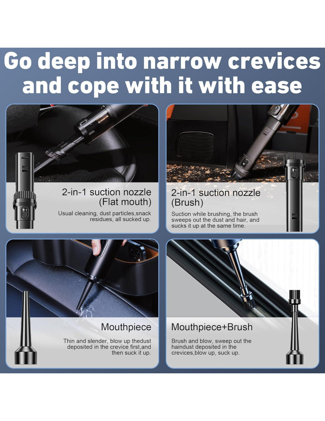- Luz LED y diseño de bloqueo de llave: El diseño de luz LED ayuda a limpiar rincones invisibles del coche, sin perder ningún lugar de polvo. El diseño de bloqueo de llave facilita vaciar la basura con un clic sin manos sucias, y el recipiente de polvo desmontable se puede lavar directamente para asegurar que la aspiradora portátil permanezca limpia después de su uso.