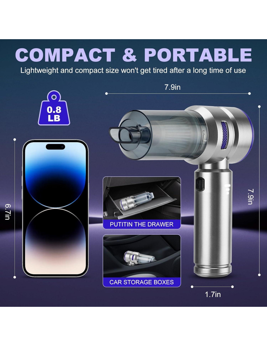 - [Carga Rápida y Larga Duración] La mini aspiradora de coche viene con una batería recargable de 6000mAh incorporada y un cable de carga rápida Tipo-C, que se puede cargar fácilmente utilizando un cargador de coche, banco de energía, laptop u otros métodos. Una vez completada la carga, puede proporcionar hasta 30 minutos de tiempo de funcionamiento para tareas de limpieza exhaustivas