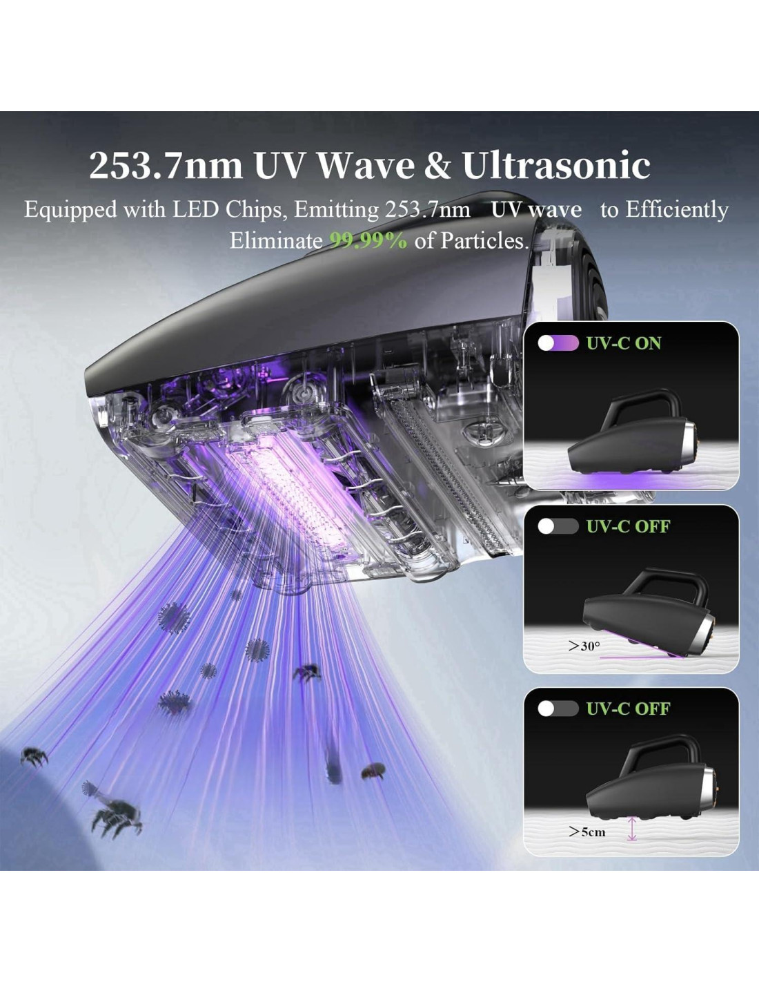 - [Función mejorada 6 en 1] La limpiadora de colchones utiliza seis métodos como motor de 450W, succión potente de 15KPa, golpeteo de alta frecuencia 120000 veces/min, onda de 253.7nm, aire caliente a 60C, y sensor de polvo inteligente, que pueden limpiar de manera más completa y exhaustiva y darte un ambiente hogareño más saludable.