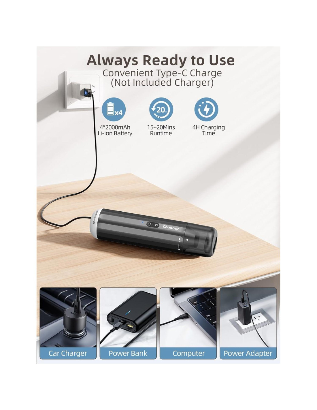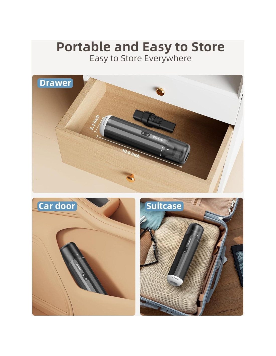 CHUBOOR es una marca líder en electrodomésticos de limpieza del hogar enfocada en la innovación, investigación, fabricación y ventas. Estamos redefiniendo la limpieza tradicional al crear una nueva generación de soluciones inteligentes y de un solo paso. Nuestra misión es hacer que la limpieza sea más simple y conveniente para cada hogar. La Aspiradora de Mano Inalámbrica CHUBOOR ofrece una experiencia poderosa y sin complicaciones, llevando la limpieza eficiente e inteligente al siguiente nivel. La batería de 8000mAh de iones de litio proporciona hasta 20 minutos de limpieza profunda para desorden en su hogar, auto y oficina. Puerto de Carga Tipo-C, fácil de cargar en cualquier momento y lugar. ¡Carga completa en 4 horas! Solo 1.3 libras (0.59 kg) ultra ligera, portátil y fácil de almacenar en cualquier lugar.