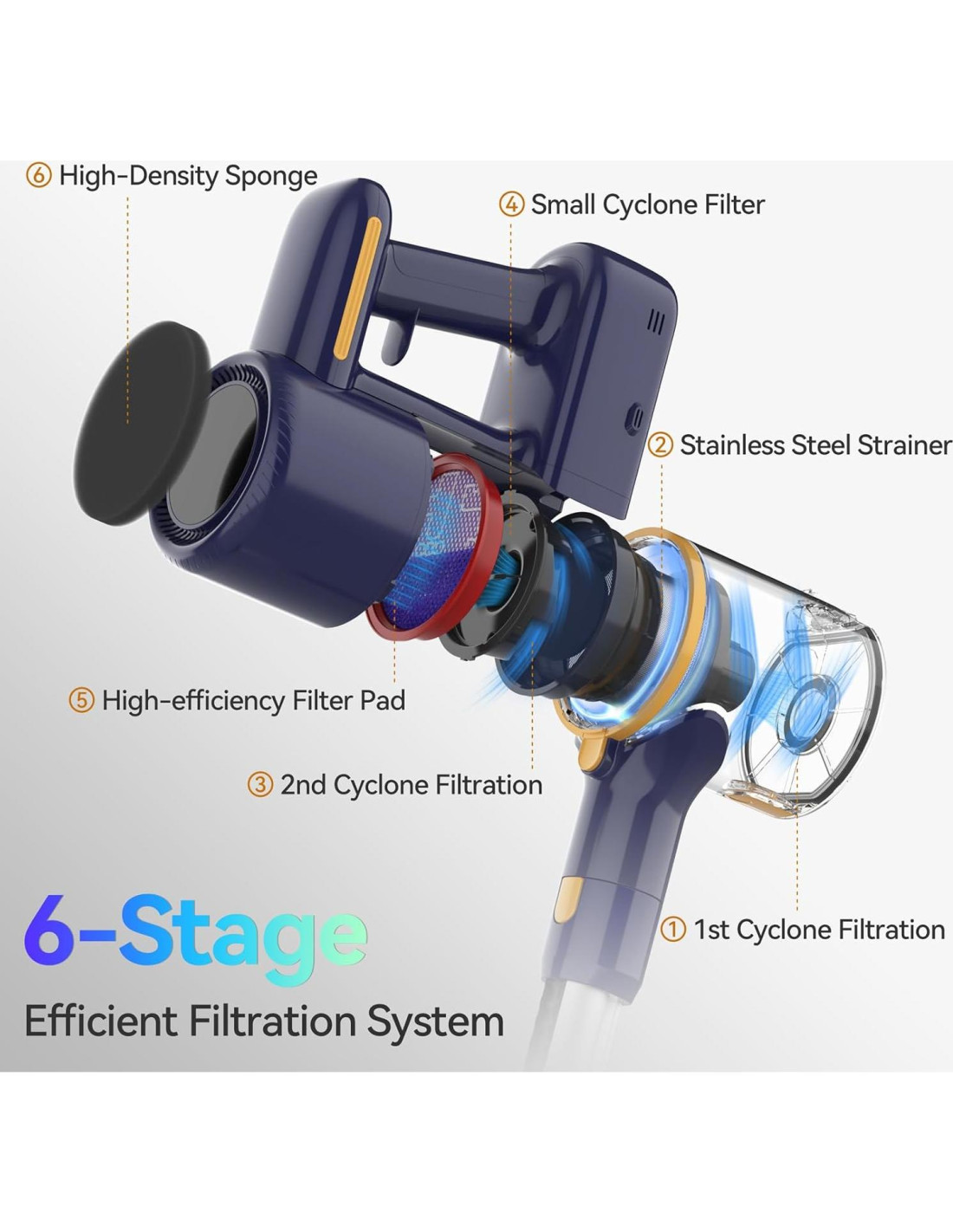 - [Filtración Eficiente y Filtro Extra] Esta aspiradora de varilla inalámbrica incorpora un sistema de filtración eficiente que captura y filtra partículas de polvo microscópicas, asegurando un ambiente limpio y saludable para tu familia. El filtro y el colador también protegen el motor de la aspiradora, asegurando un rendimiento óptimo. Recuerda limpiar el filtro regularmente y reemplazarlo si está desgastado. Se incluye un filtro extra para un reemplazo conveniente.