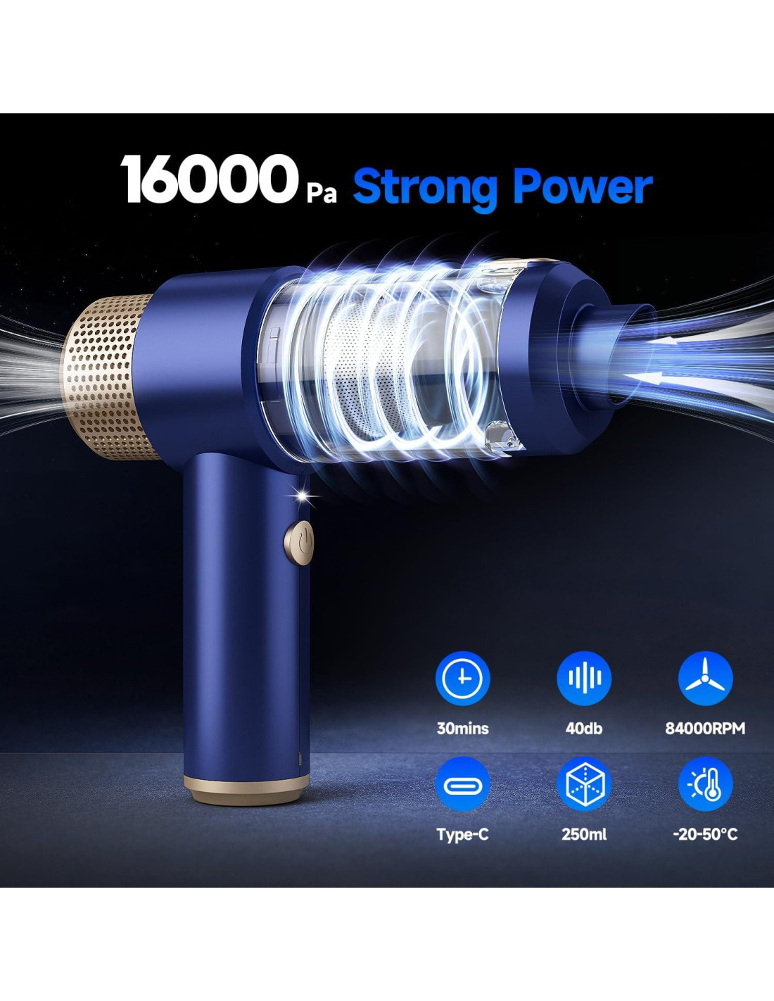 - [Aspiradora Mini de 16000Pa] : La aspiradora portátil de coche inalámbrica está equipada con un motor japonés de nueva generación para una alta eficiencia de limpieza. La potente succión de 16000Pa de la pequeña aspiradora es lo suficientemente fuerte como para eliminar polvo, pelo de mascotas, restos de comida, confeti y otras manchas comunes. La estructura interna especial y el diseño de protección del circuito aseguran que el motor disipe el calor rápidamente y sea más duradero y de larga duración.
