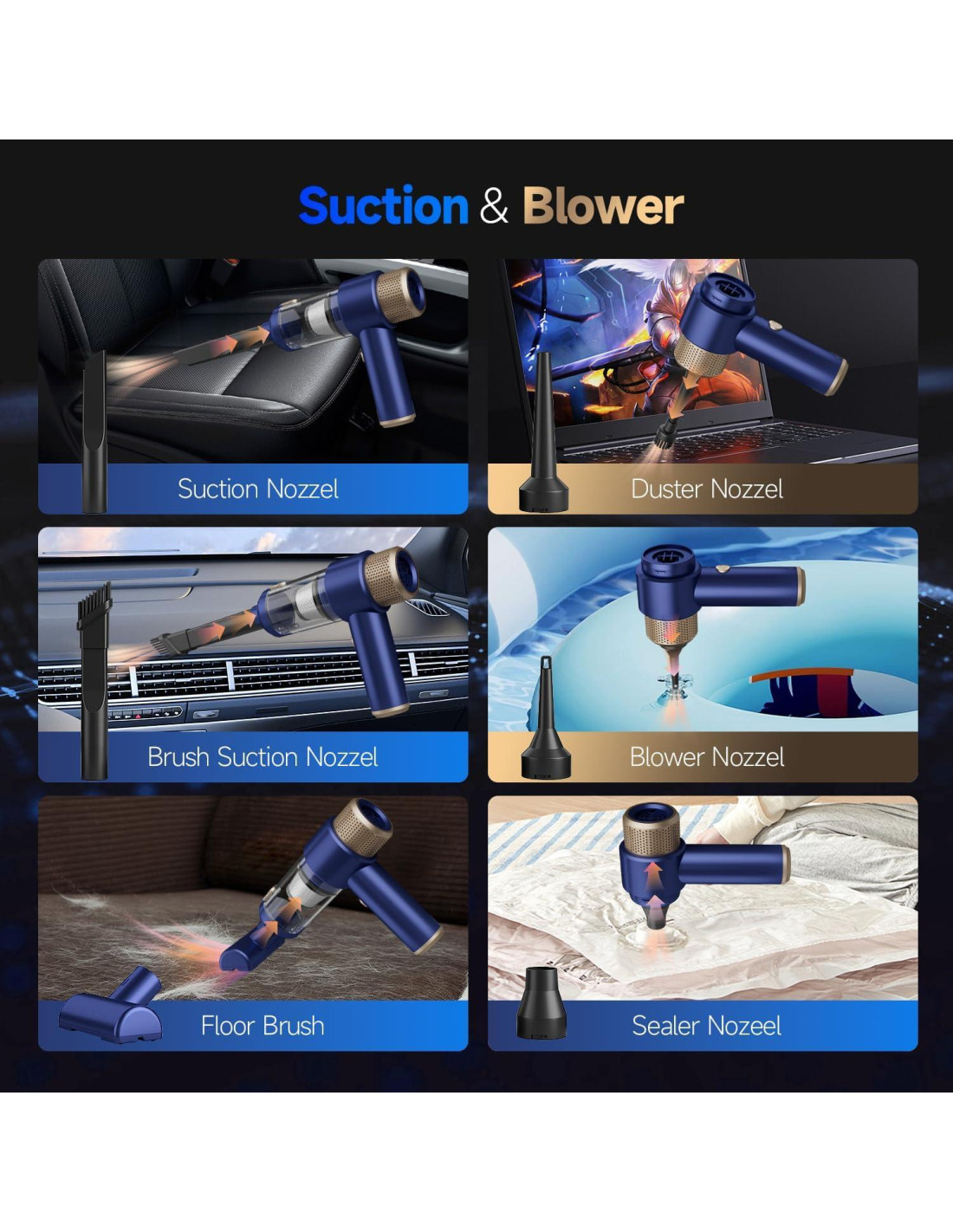 - [Aspiradora de Coche Inalámbrica Multifuncional 7 en 1] : La aspiradora de mano inalámbrica con 7 accesorios soporta múltiples modos, como aspirar, soplar, inflar, bombear. La aspiradora de mano puede satisfacer diferentes necesidades para tareas de limpieza diarias e incluso limpiar rincones de difícil acceso, como soplar o aspirar polvo o escombros de asientos, teclados, unidades de computadora, lentes de cámara y esquinas de armarios, o inflar o expulsar aire de anillos de natación y colchones, o soplar aire para encender fuego en la parrilla, etc.