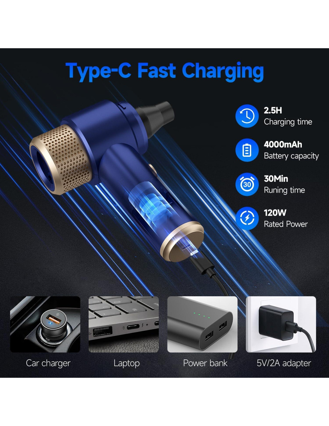 - [Carga Rápida Tipo-C] : esta aspiradora para coche utiliza una batería de 4000mAh incorporada y puedes usar el puerto USB de la computadora, batería móvil, cargador de coche o adaptador de 5V/2A para cargar completamente la mini aspiradora de coche en 2.5 horas.