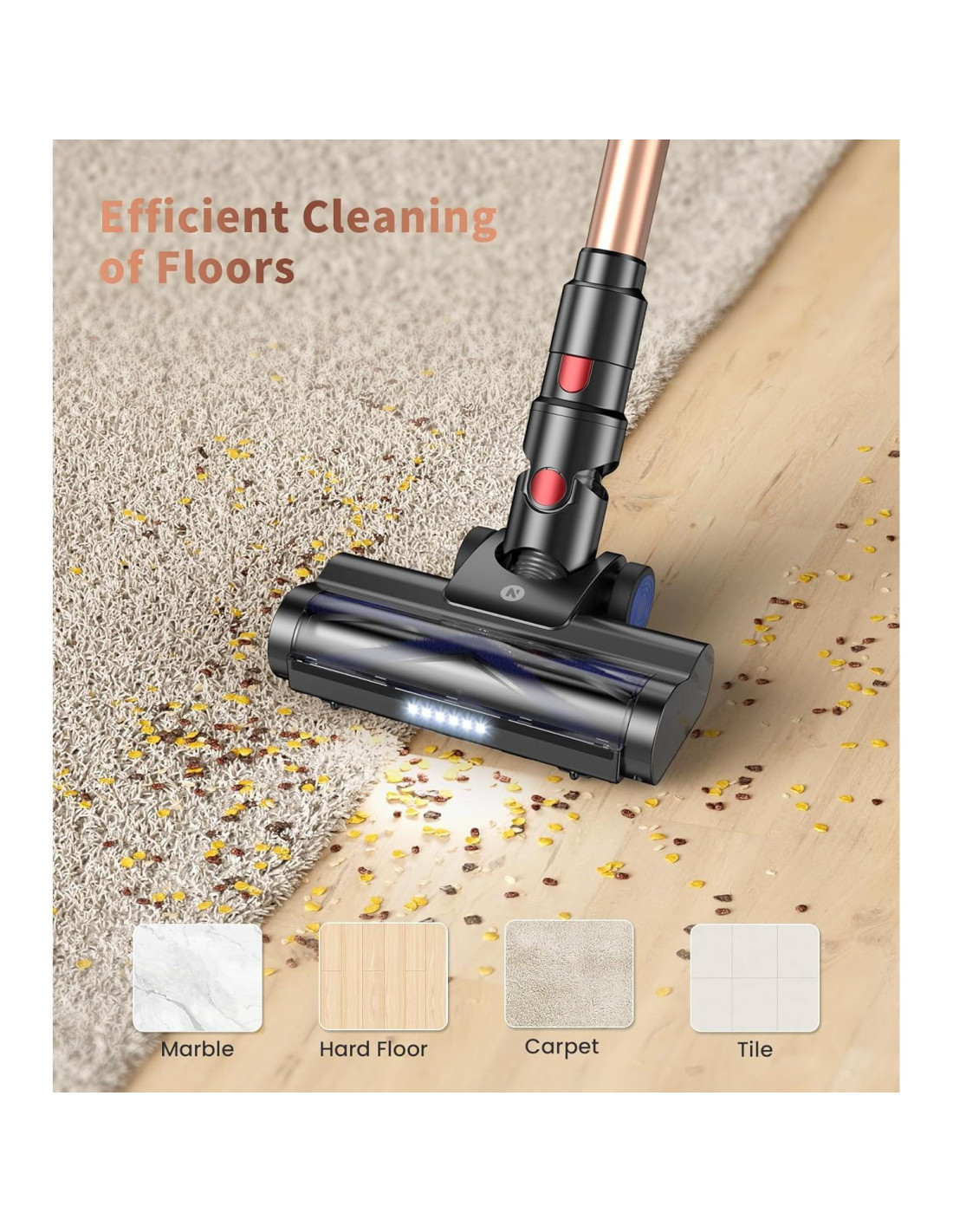 - La aspiradora para suelos de madera viene con una luz LED y un cepillo de suelo rotatable, lo que facilita la limpieza de los puntos muertos debajo de los muebles sin moverlos. El cepillo rodante en forma de V antienredos mejorado resuelve eficazmente el problema de enredos de pelo que es común con las aspiradoras tradicionales.