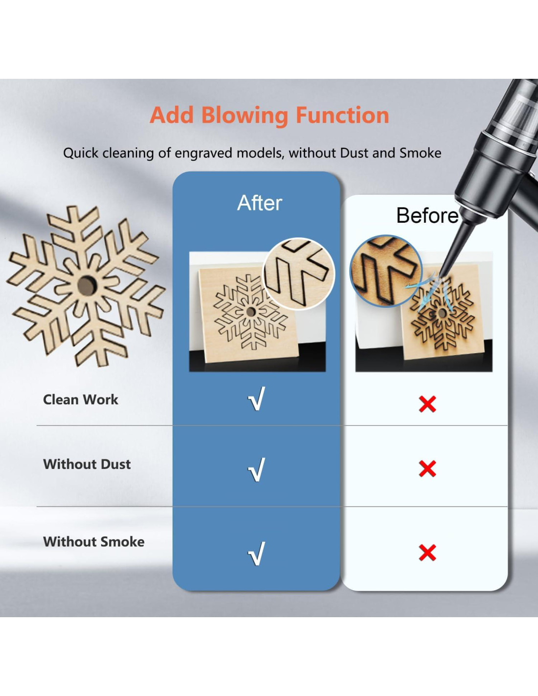 - Agregar Función de Soplado: Limpieza rápida de modelos grabados, sin polvo ni humo. Succión fuerte de 4000Pa, fácil de limpiar.