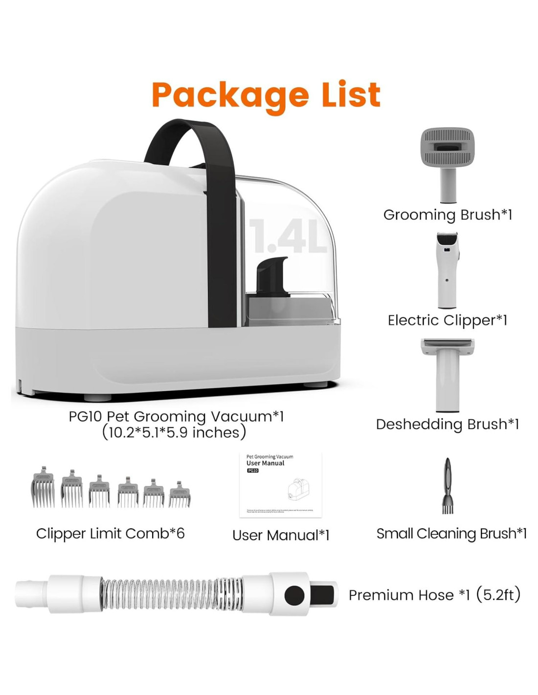 - Lo Que Obtienes: Aspiradora para acicalamiento de mascotas, cepillo de acicalamiento, cortadoras de perros con 6 peines de protección ajustables, cepillo deshedding para perros, instrucciones. Disfruta de 1 Año de Garantía. La aspiradora para pelo de perro es el regalo perfecto para padres de mascotas y amantes de las mascotas. Disfruta del tiempo con tu mascota en casa, evitando los desagradables viajes de la mascota a la tienda de acicalamiento.