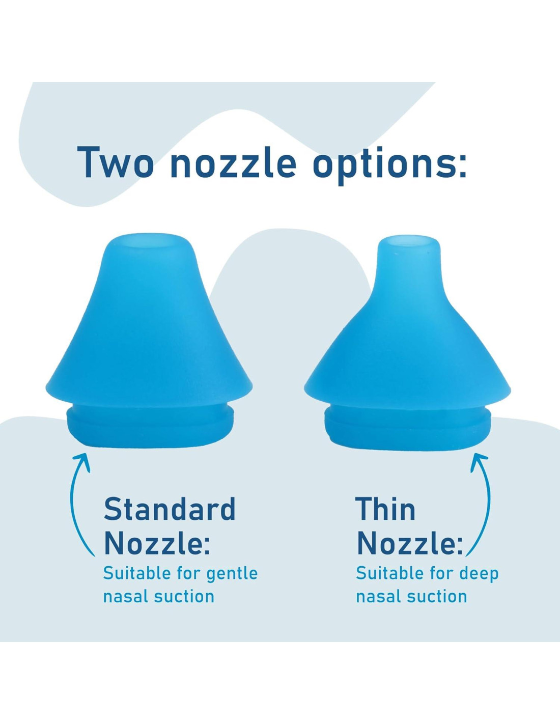 - Incluye dos opciones de boquilla: Boquilla Estándar - Adecuada para Succión Nasal Suave, y Boquilla Fina - Adecuada para Succión Nasal Profunda