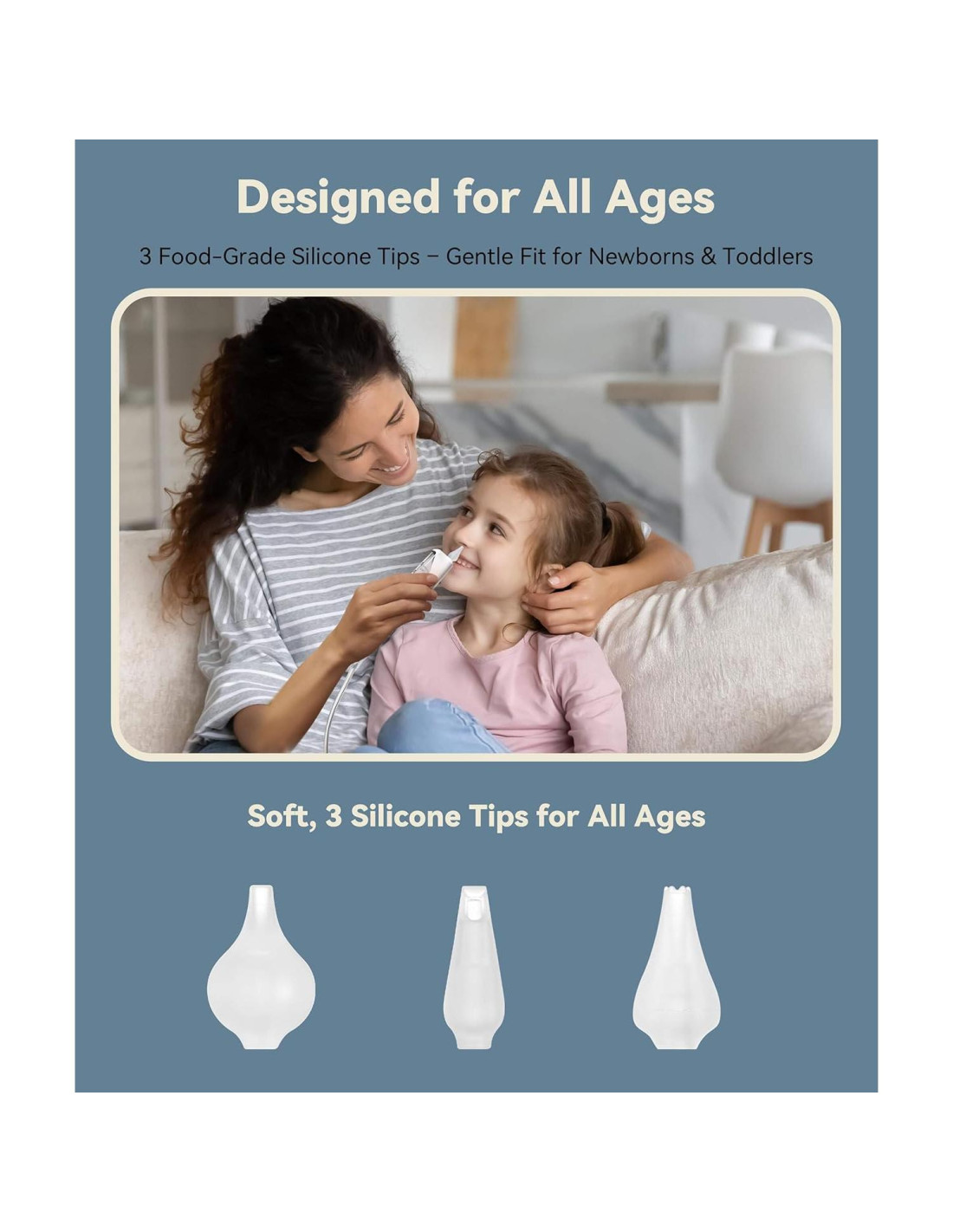 - Puntas de Silicona de Grado Alimenticio - Viene con 3 puntas suaves e intercambiables adecuadas para diferentes grupos de edad. Esto asegura un ajuste cómodo, lo que lo convierte en un succionador de nariz ideal para recién nacidos y niños pequeños por igual.