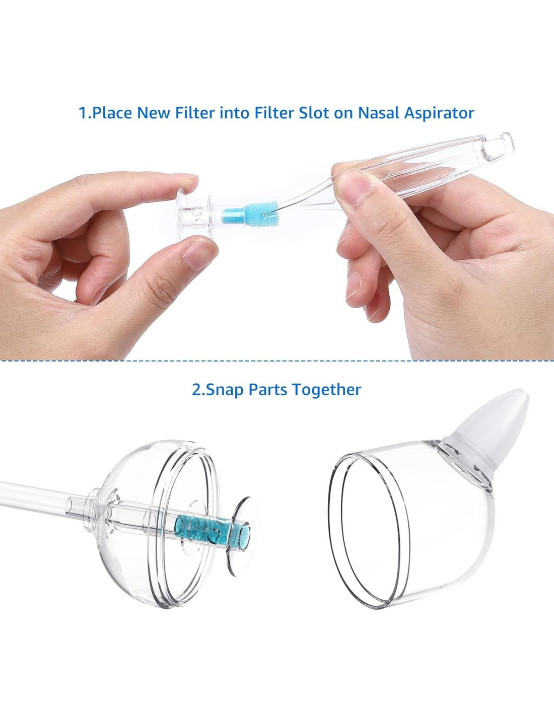 - Los recambios de filtro para el aspirador nasal son desechables, higiénicos y eficientes, previniendo efectivamente la transferencia de moco nasal o mocos.