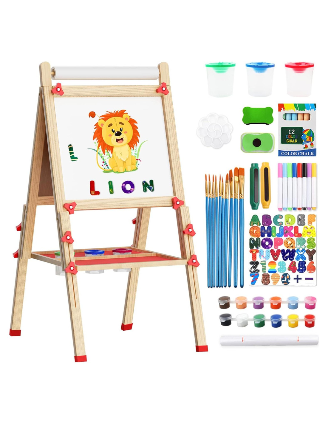 - [Caballete Magnético Doble] Cada lado del caballete tiene una placa magnética anti-torsión para aumentar la practicidad del caballete. La parte superior del caballete tiene un rollo de papel removible para pintar con pintura. Estas características añaden al espacio creativo del caballete y ofrecen una variedad de formas de jugar con él.