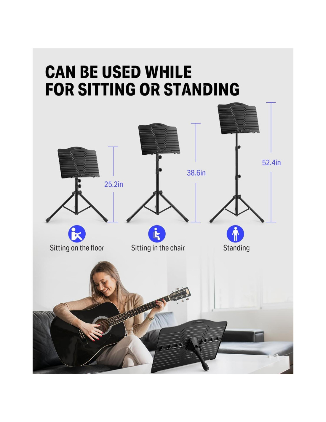 - Robusto y Duradero: La placa de libro está hecha de ABS resistente y puede soportar 12 libras (5.44 kg) de objetos pesados como libros/computadora/proyector. El eje y las patas están hechos de acero tubular de alta resistencia, lo que garantiza la estabilidad y durabilidad del soporte de música.