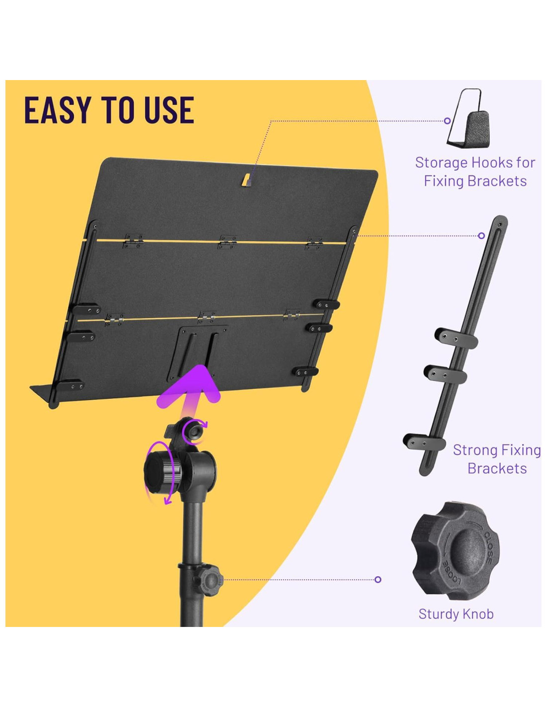 - FÁCIL DE ENSAMBLAR Y DESENSAMBLAR: Simplemente retira los soportes de fijación de los ganchos en la parte posterior del panel, el soporte de música se puede plegar en un tamaño pequeño que es muy conveniente para llevar.