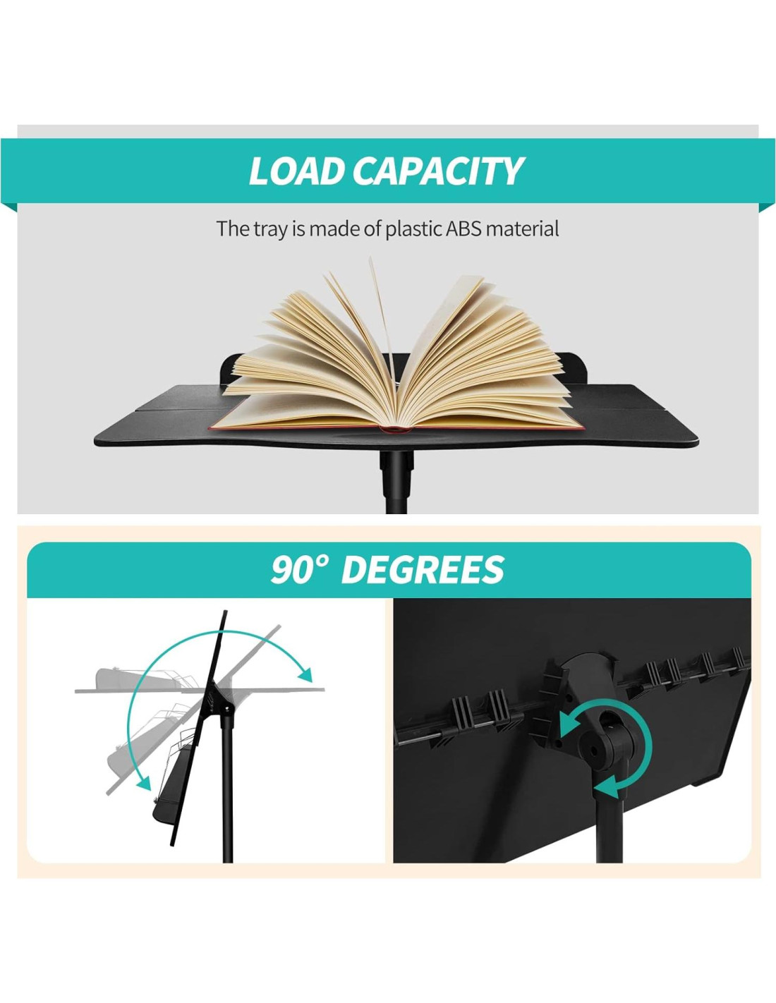 - Bandeja Grande: El tamaño de la bandeja es 45*27.5cm/17.7*10.6pulgadas, el tamaño después de plegar es 45-13.7cm/17.7*5.4pulgadas, el borde de soporte de partituras es 3*36cm/1.18*14.17pulgadas, y la bandeja puede inclinarse 180, suficiente para sostener cualquier tipo de partitura o libro. (NOTA: No se recomienda colocar equipos pesados como proyectores)