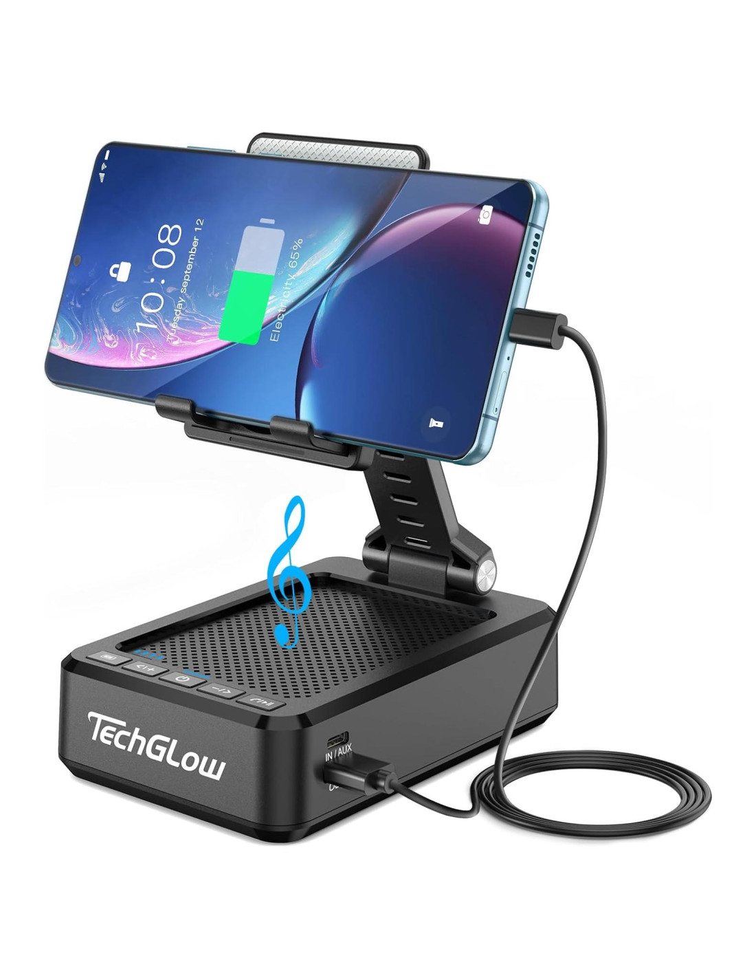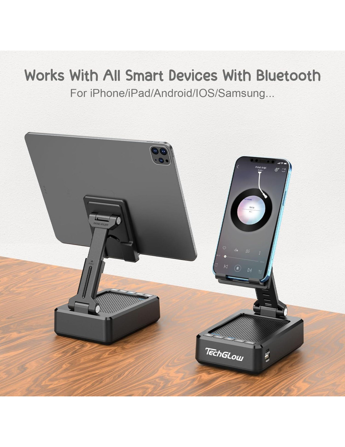 - [Funciona para smartphones y tablets de 4-13"] El altavoz soporte para teléfono TechGlow funciona con la mayoría de smartphones y tablets de 4-13" con función Bluetooth. También se puede usar como altavoz externo para laptop o computadora con conexión AUX.