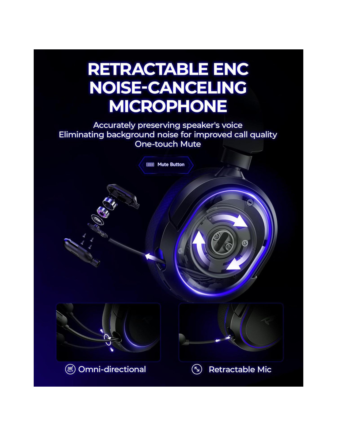 - [Micrófono Retráctil con Cancelación de Ruido ENC y Silencio con un Toque] Equipado con un micrófono omnidireccional de cancelación de ruido de 360. Nuestro auricular inalámbrico puede calcular con precisión la dirección del altavoz, preservando la voz objetivo mientras elimina el ruido de fondo para mejorar la calidad de la llamada. Los auriculares gaming con micrófono aseguran que tu voz se transmita con claridad en alta definición a tus compañeros de equipo, incluso en medio de la batalla. Mientras tanto, el micrófono retráctil combina las ventajas de varios tipos de micrófonos: latencia ultra-baja, alta reproducción de sonido, ocultabilidad y portabilidad, el regalo perfecto para jugadores y entusiastas de la música.