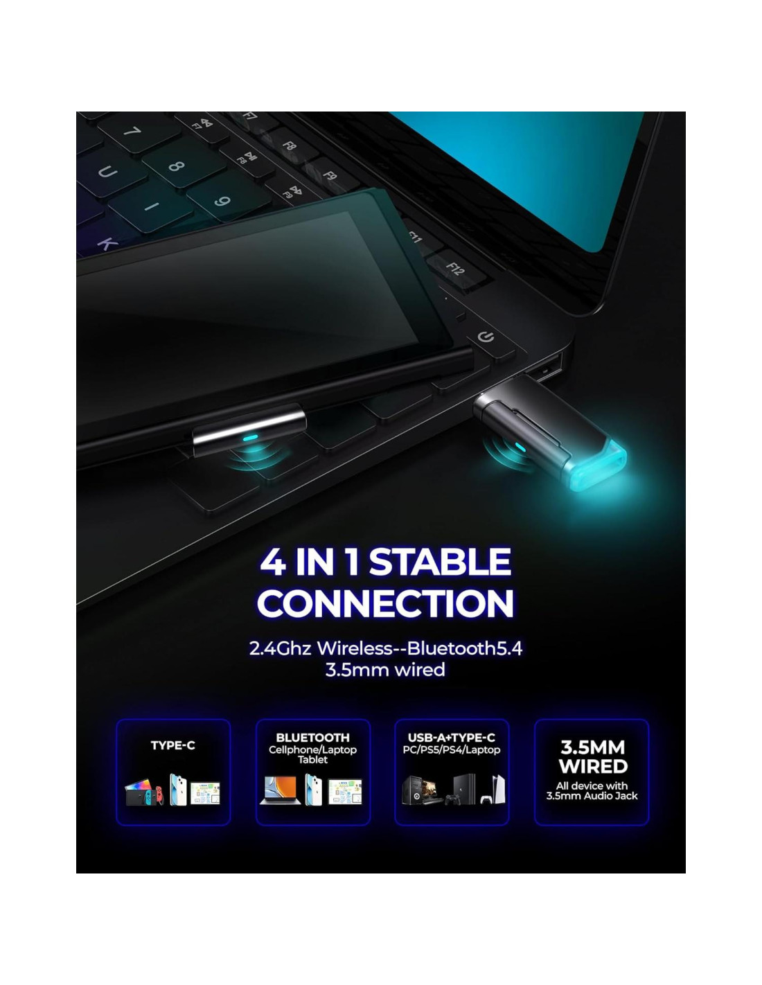 - [Compatibilidad Multiplataforma 4 en 1] Diseño único de conexión 2 en 1 (equipado con adaptador USB y dongle Type-C) hace que este auricular inalámbrico sea ampliamente compatible con playstation 5, PS4, PC, Mac, teléfono, tablet, Nintendo Switch (micrófono no válido); el modo Bluetooth del auricular es compatible con teléfonos móviles, tabletas, iPad y otros dispositivos inteligentes. Se proporciona un cable Aux de 3.5mm adicional para otros controladores de juego con puerto de 3.5mm.