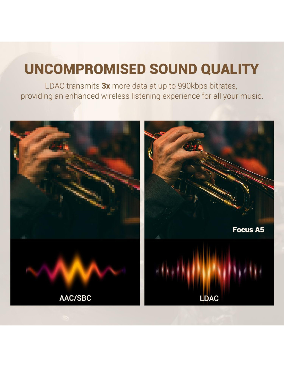 - Sonido de Grado de Estudio, Dondequiera Que Estés. Los auriculares con cancelación de ruido Focus A5 admiten LDAC para sonido inalámbrico Hi-Res. LDAC permite la transmisión de contenido de audio, incluyendo Audio de Alta Resolución (Hi-Res), a la tasa de bits máxima de 990kbps incluso a través de una conexión Bluetooth. Con 3 veces la cantidad de datos transmitidos, LDAC proporciona una experiencia de escucha inalámbrica mejorada para toda tu música.