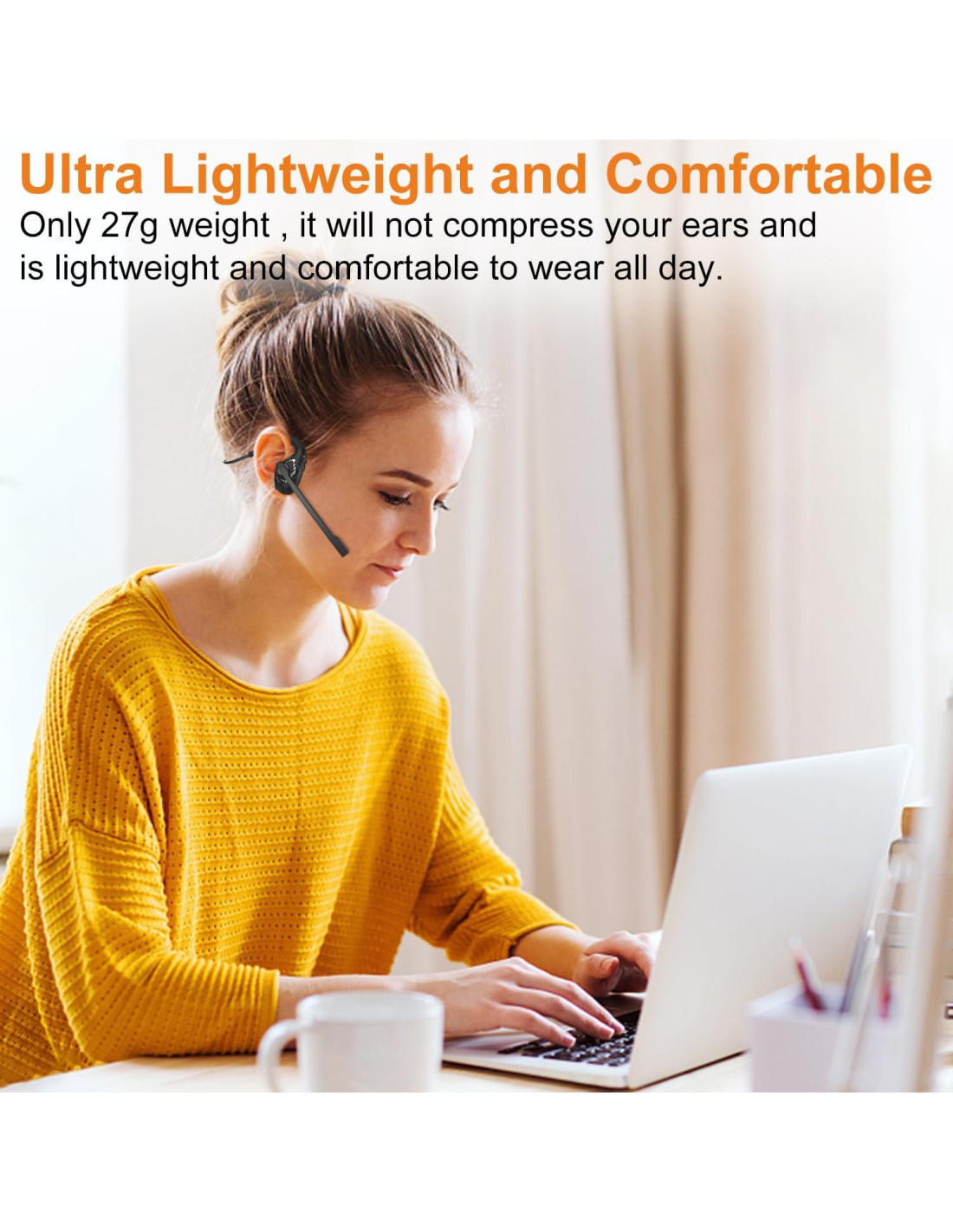 - Ultra-ligero y cómodo. Este auricular Bluetooth pesa solo 27g, hecho de una diadema de titanio ultra-ligera y flexible, que puede doblarse 360 a voluntad para restaurar la originalidad de inmediato, se adapta bien a la forma de la oreja y reduce la presión sobre los oídos, experimentando una comodidad inigualable que no se moverá ni caerá durante largos períodos de ejercicio.