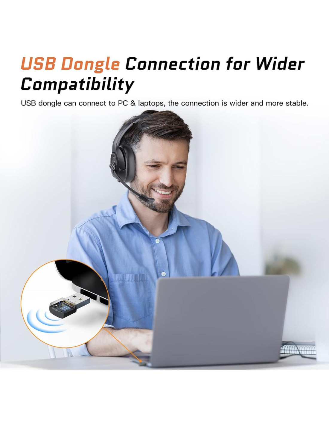 - [Amplia compatibilidad a través de Bluetooth 5.0 y dongle USB] La última tecnología Bluetooth y el potente chip Qualcomm integrado de los auriculares bluetooth para teléfonos aseguran una conexión ultrarrápida y ultraestable. Simplemente con un dongle USB (incluido), sin complicaciones adicionales para conectar este auricular bluetooth para camioneros a tus dispositivos Bluetooth y PC o laptop deseados.