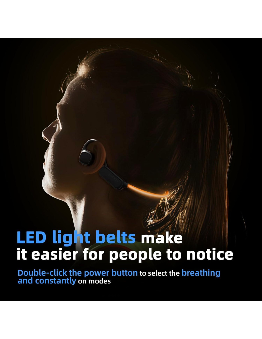 - Ilumina tu noche: Imagina que estás en una carrera nocturna. Nuestros auriculares cuentan con una tira de luz LED que no solo se ve genial, sino que también asegura que seas visible para los demás. Elige entre modos de luz intermitente, parpadeante o constante para adaptarte a tu estado de ánimo y entorno, haciendo que tus actividades nocturnas sean más seguras y agradables.