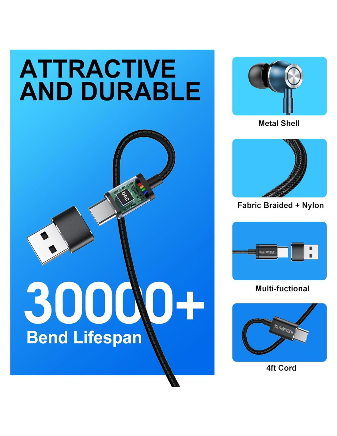 - Experiencia de Escucha Rica - Los auriculares con cable USB Tipo C RAYHONTECH tienen un controlador dinámico de 10 mm, por lo que también podrías llamarlo auriculares USB C de bajo sólido. Con esta tecnología, estos auriculares USB C de bajo profundo podrían crear una experiencia única y proporcionar más entretenimiento al escuchar. Un punto más sobre estos auriculares USB en el oído es el aislamiento de ruido que tienen. Comparado con otros auriculares USB C, este auricular tipo c en el oído podría proporcionar un mejor aislamiento de ruido que los auriculares tipo c en el oído normales.