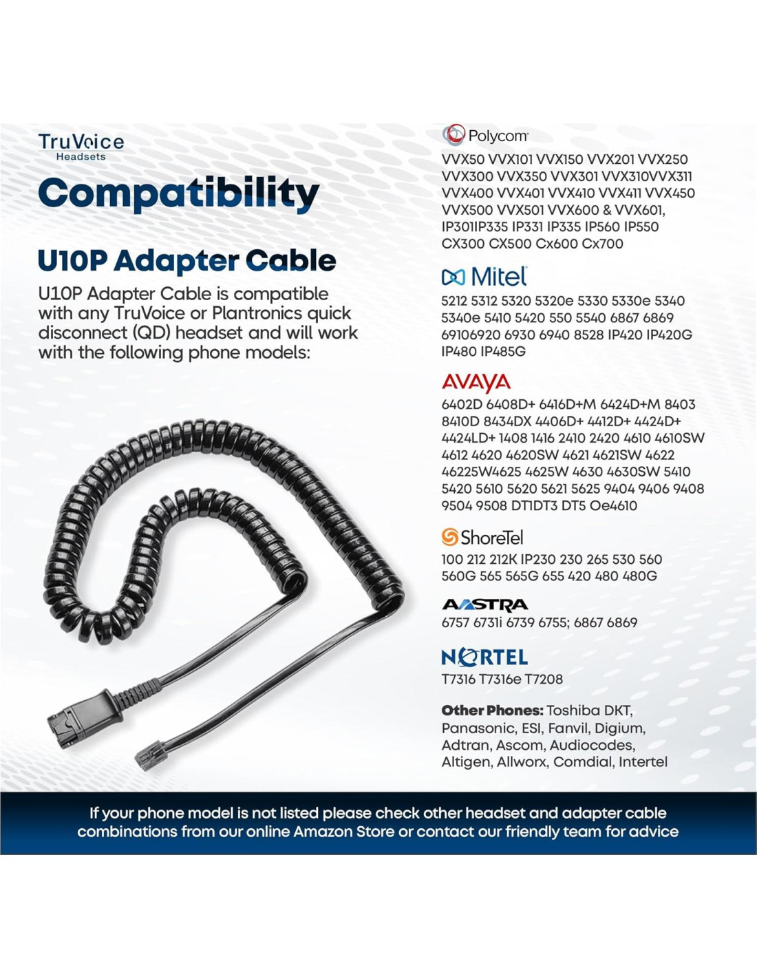- COMPATIBILIDAD: El adaptador U10P incluido es compatible con: POLYCOM / POLY EDGE Series y VVX50 VVX101 VVX150 VVX201 VVX250 VVX300 VVX350 VVX301 VVX310 VVX311 VVX400 VVX401 VVX410 VVX411 VVX450 VVX500 VVX501 VVX600 y VVX601, IP301 IP335 IP331 IP335 IP560 IP550 CX300 CX500 CX600 CX700, 485 y Modelos Aastra 6757i 6731i 6739i 6755i 6867i 6869i, Nortel T7316 T7316e T7208, Modelos Mitel 5212 5312 5320 5320e 5330 5330e 5340 5340e 5410 5420 550 5540 6867i 6869i 6910 6920 6930 8528 IP420 IP420G IP480 IP485G