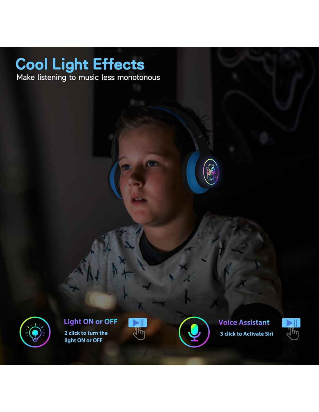 - [Iluminación Genial] Nuestros auriculares bluetooth para niños vienen con iluminación LED RGB colorida, se puede hacer doble clic en el botón para controlar encendido y apagado, la iluminación genial no solo puede despertar la curiosidad de los niños, sino también hacer que los niños ya no se sientan solos por la noche, brindando una experiencia musical única a los niños.