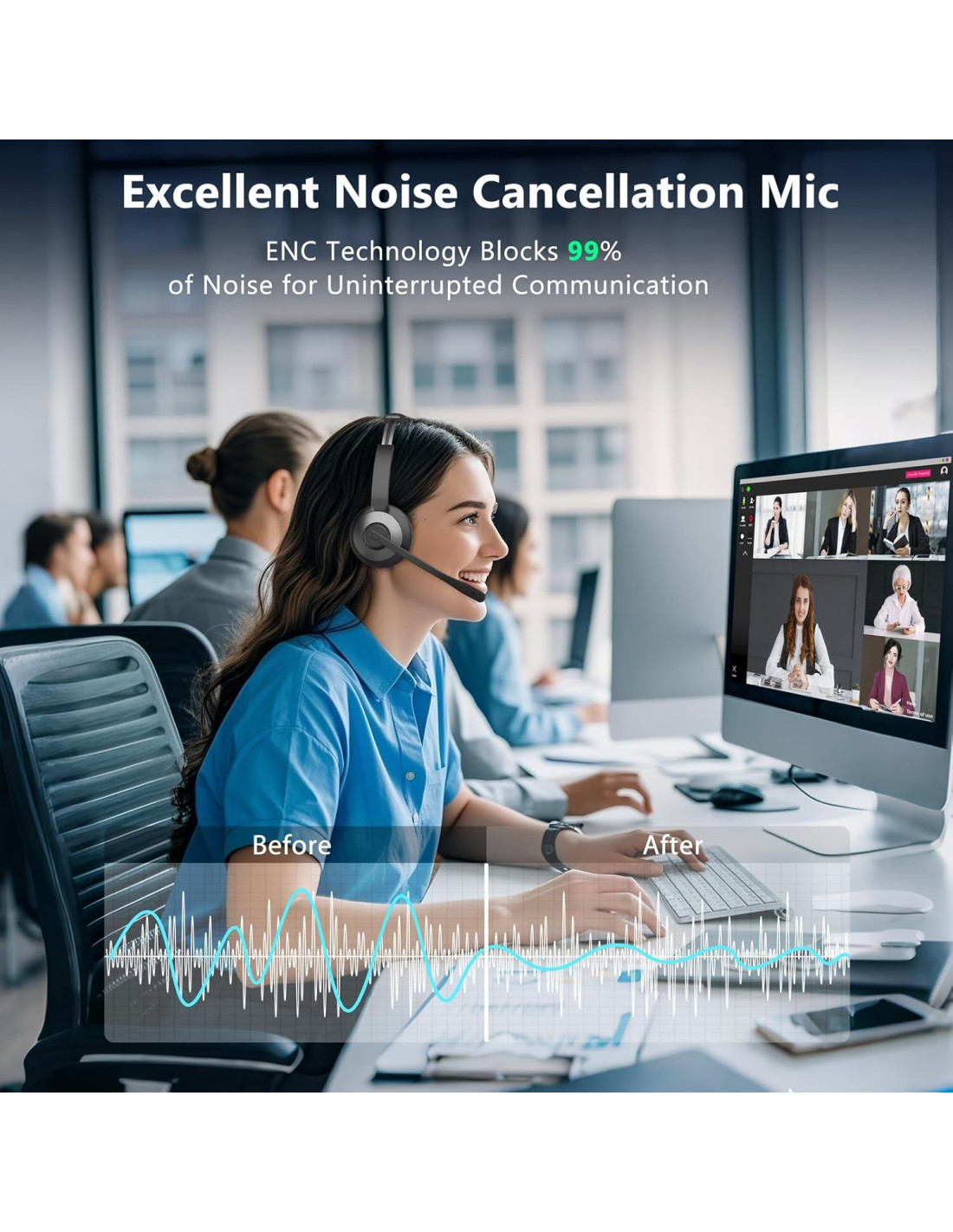 - [Conectividad Sin Costuras, Control Simple] Empareja sin problemas estos auriculares inalámbricos con micrófono con dos dispositivos simultáneamente, perfecto para cambiar entre llamadas de trabajo y dispositivos personales. Diseñado para Zoom, Skype, Teams y todas las principales plataformas de comunicación. Universalmente compatible con computadoras Windows/macOS, dispositivos móviles iOS/Android y tabletas. Equipado con Bluetooth 5.3 y un dongle USB incluido para una conexión rápida y estable a todos tus dispositivos. Reproduce música, responde llamadas o activa tu asistente de voz con una sola pulsación intuitiva.