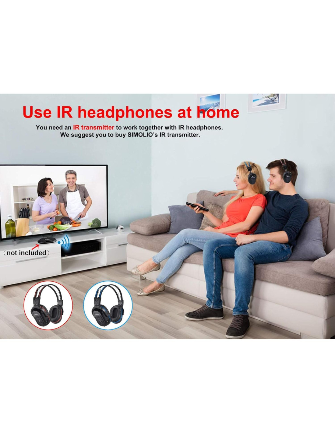 - Auriculares IR Inalámbricos: no solo son un compañero de viaje perfecto para un viaje familiar en coche, sino que también se pueden usar con un transmisor IR (no incluido) para disfrutar de programas de televisión nocturnos sin molestar a su familia o los niños pueden dejarle un espacio tranquilo usándolos para ver sus dibujos animados favoritos o jugar. Si su DVD de coche no tiene un transmisor infrarrojo incorporado o desea usar estos auriculares IR para ver televisión en casa, le sugerimos comprar nuestro Transmisor IR Simolio para un mejor rendimiento.